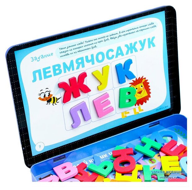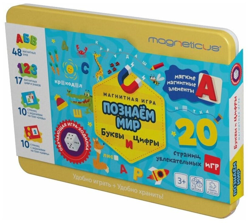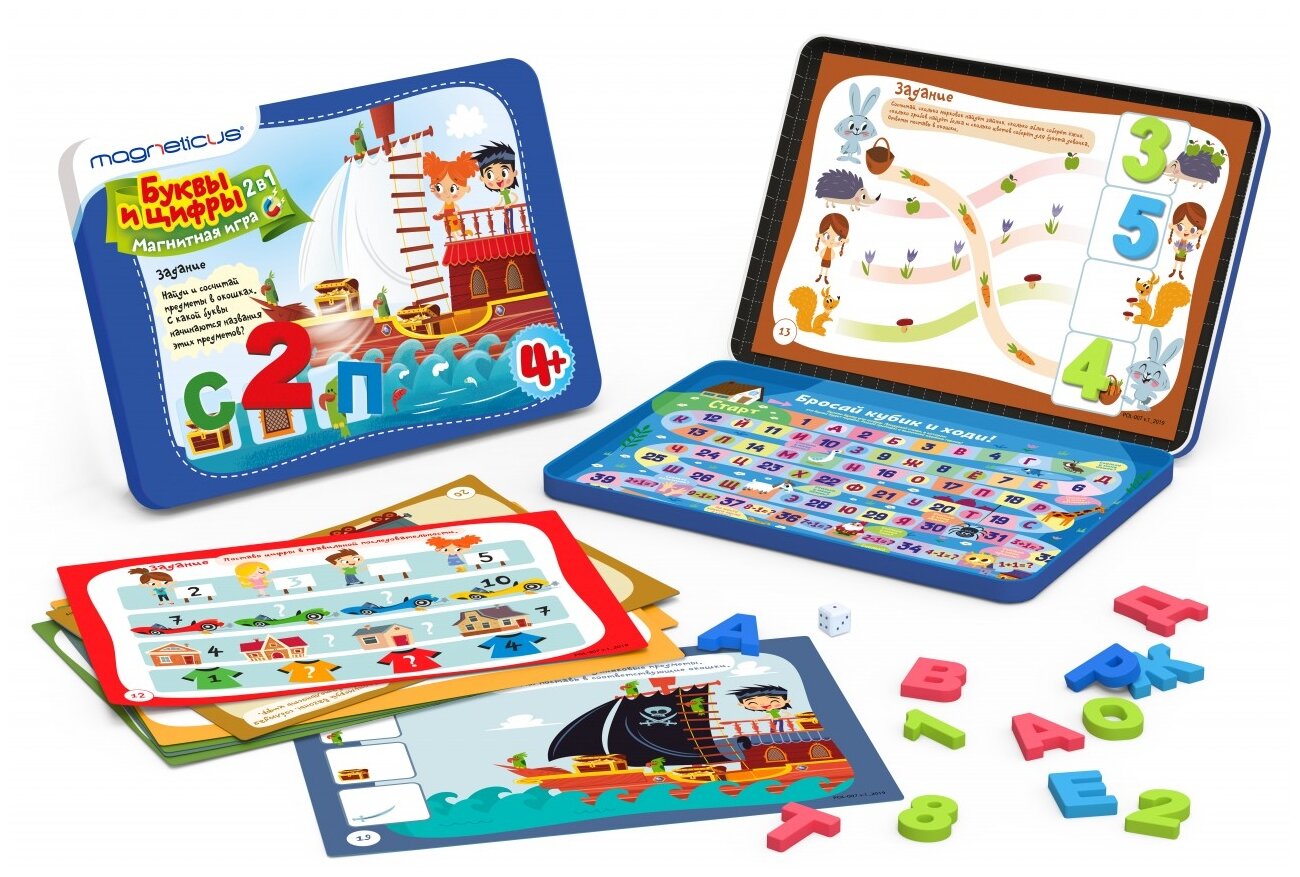 | Состав набора | 48 магнитных букв,17 магнитных цифр и знаков,10 заданий на тему Буквы, 10 заданий на тему Цифры, две игры-ходилки на тему Цифры и Буквы |