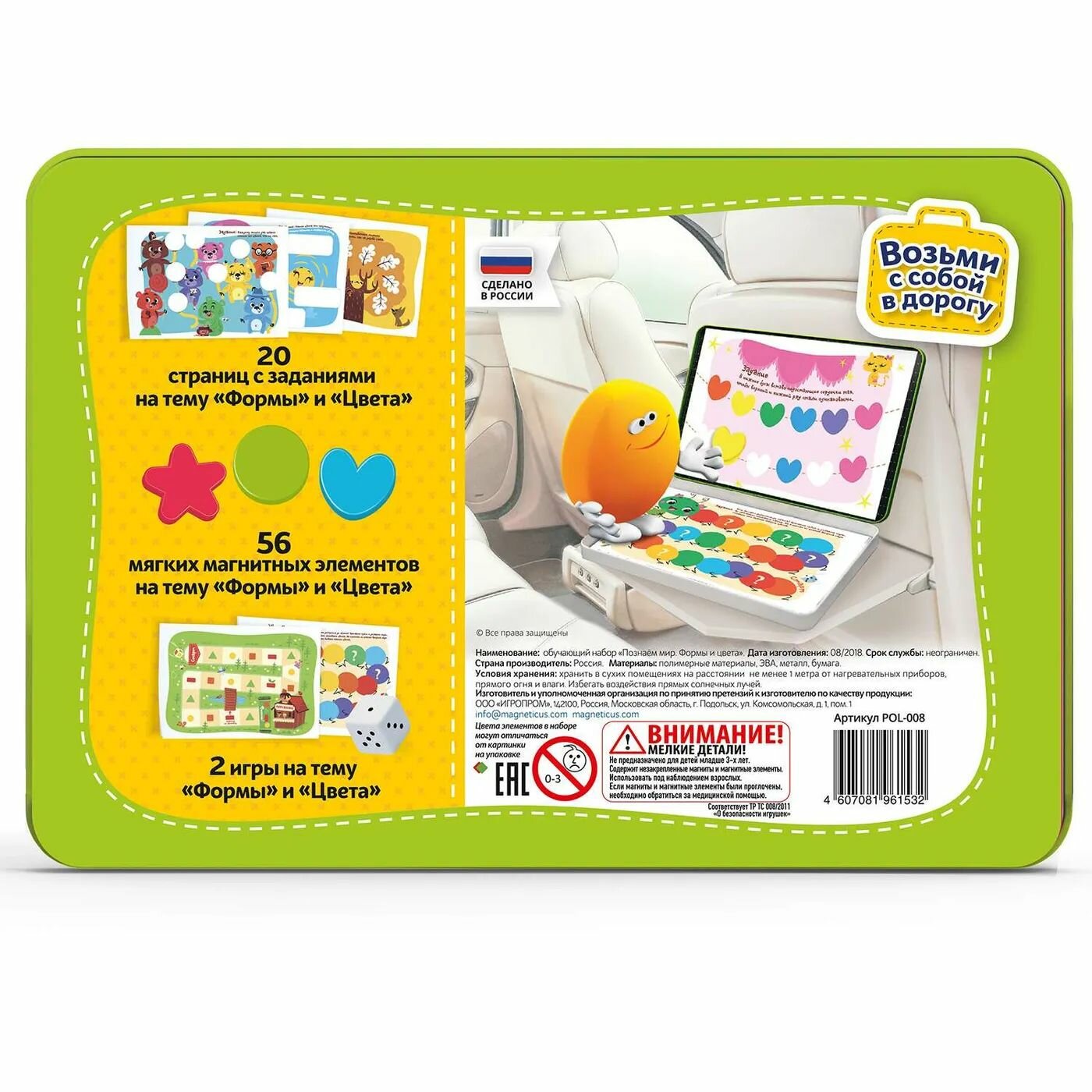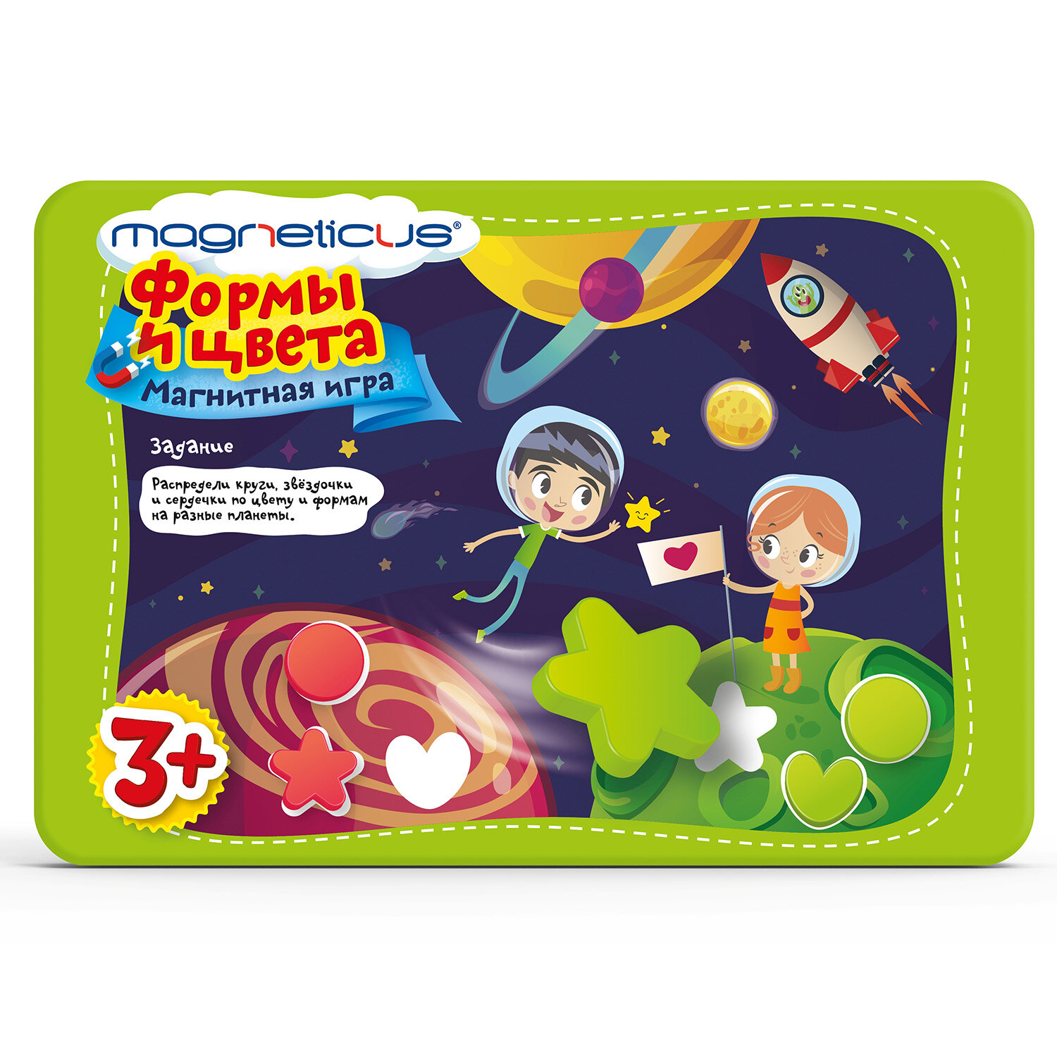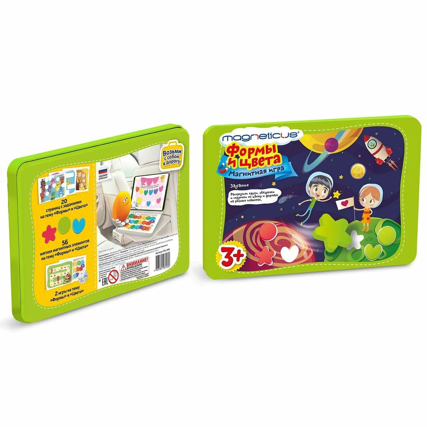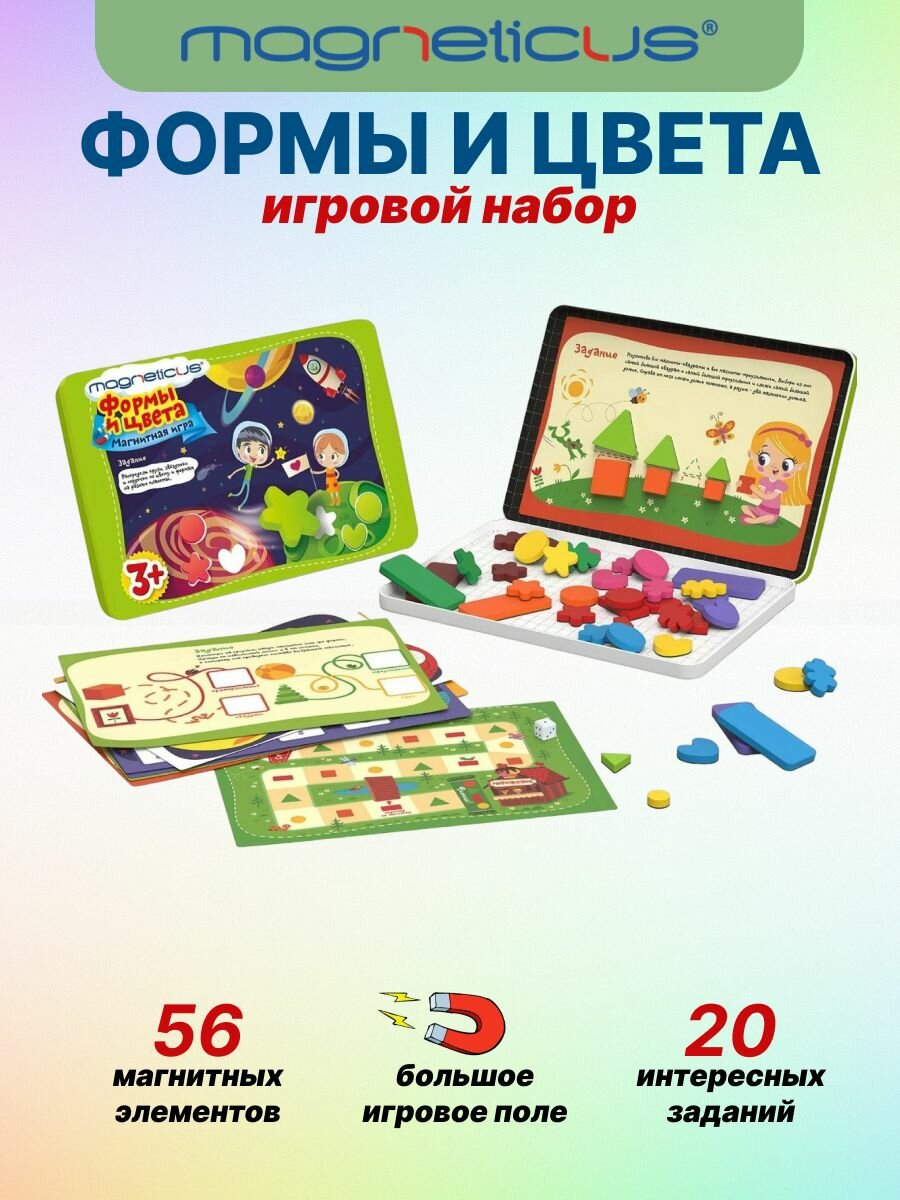 Благодаря увлекательным играм из набора от фирмы MAGNETICUS ребенок сможет познавать мир в интересной и увлекательной форме. Состав: 40 магнитных элементов «Цвета», 16 магнитных элементов «Формы», 10 заданий на тему «Формы», 10 заданий на тему «Цвета», 2 игры на тему «Цвета» и «Формы».