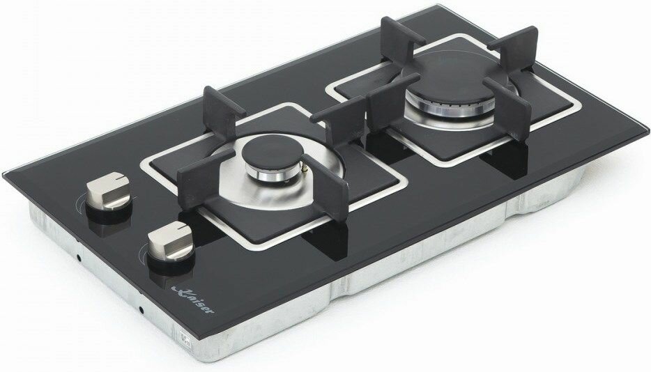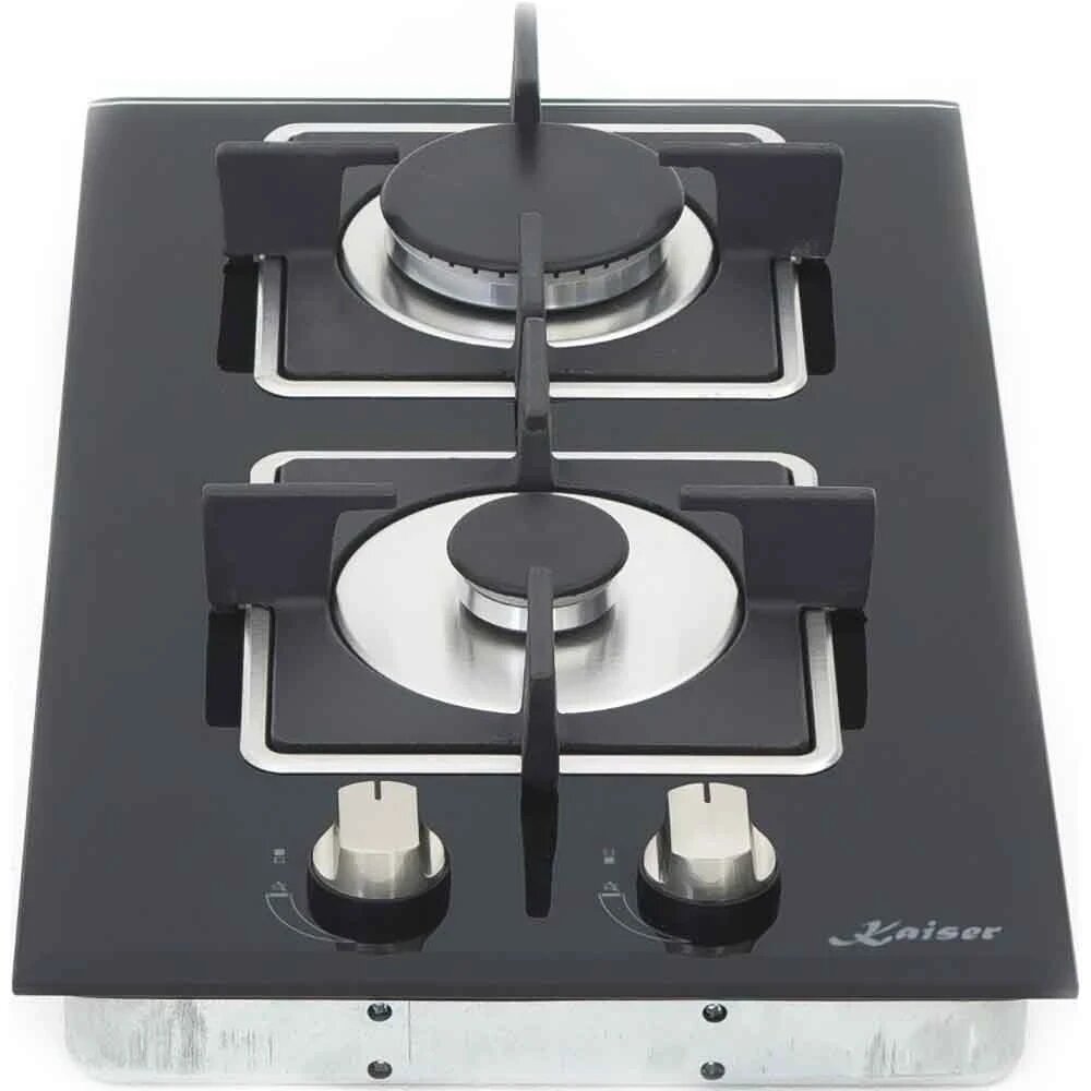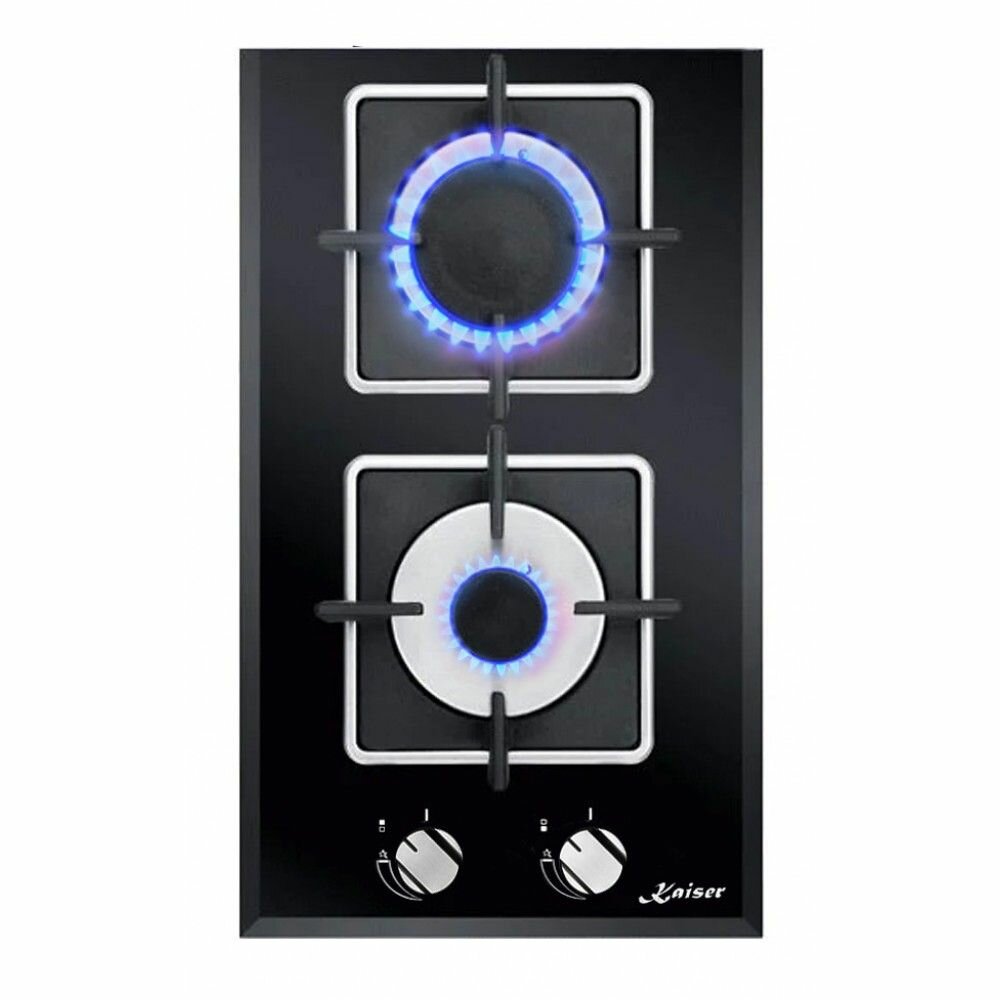 Варочная панель Kaiser на все случаи жизни Компактная двухконфорочная варочная панель Kaiser подключается к газу и управляется механическими поворотными переключателями-рычагами. Эта модель с использованием дизайна «Домино» отлично подойдет для небольшой кухни, пригодится на даче и поможет обслужить семью из двух человек. Скошенная рамка, металлические переключатели уровня пламени, логотип компании на стеклянной поверхности придают немецкой варочной панели особый шарм.