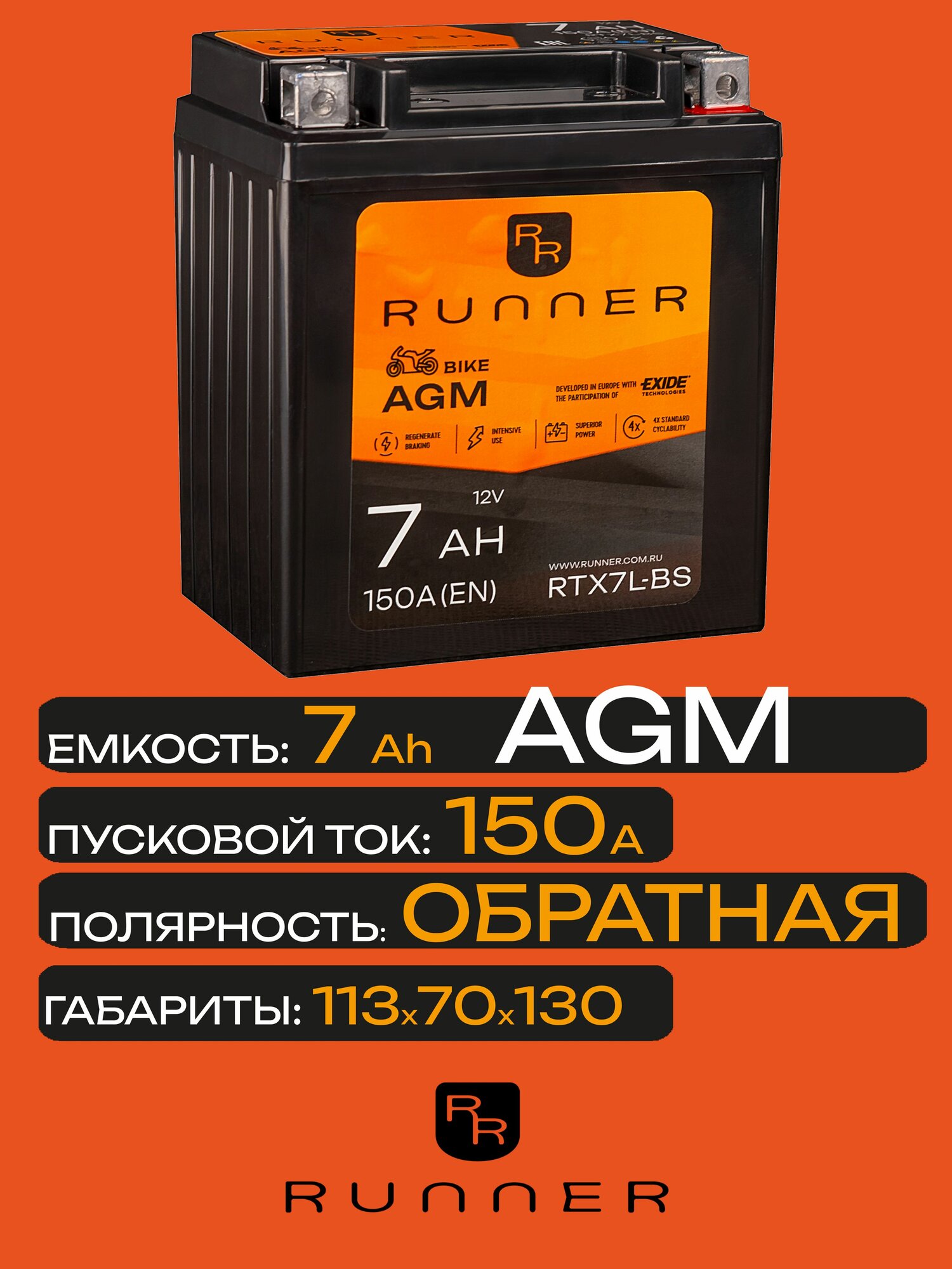 RTX7L-BS 150А Обратная полярность 7 Ач (113x70x130) Runner
