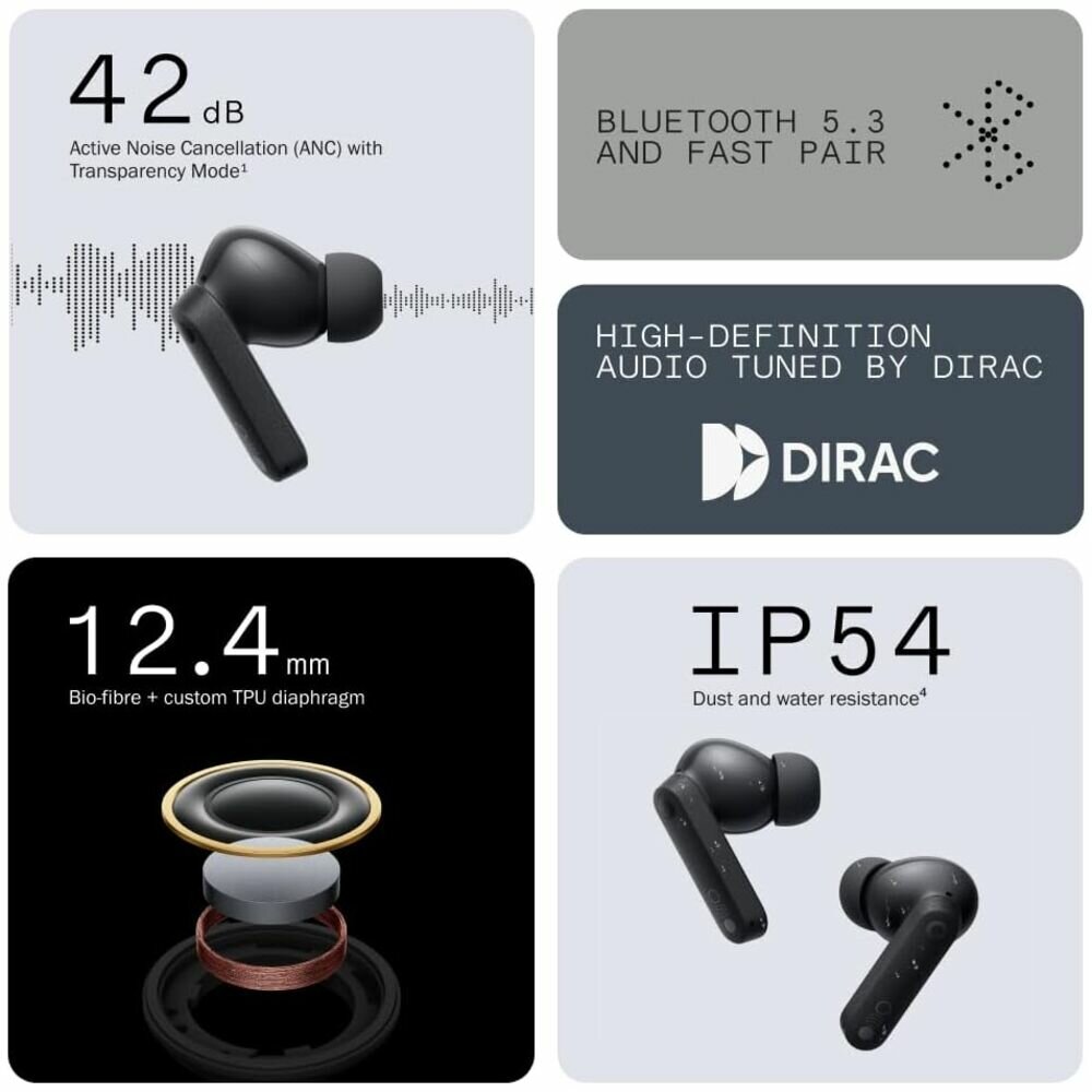 Наушники подключаются к источникам сигнала через Bluetooth 5.3 с поддержкой Google Fast Pair. Время автономной работы — около 35.5 часов (наушники + кейс). Быстрая зарядка за 10 минут даст 6,5 часов прослушивания. Корпус с защитой от воды/пыли IP54.