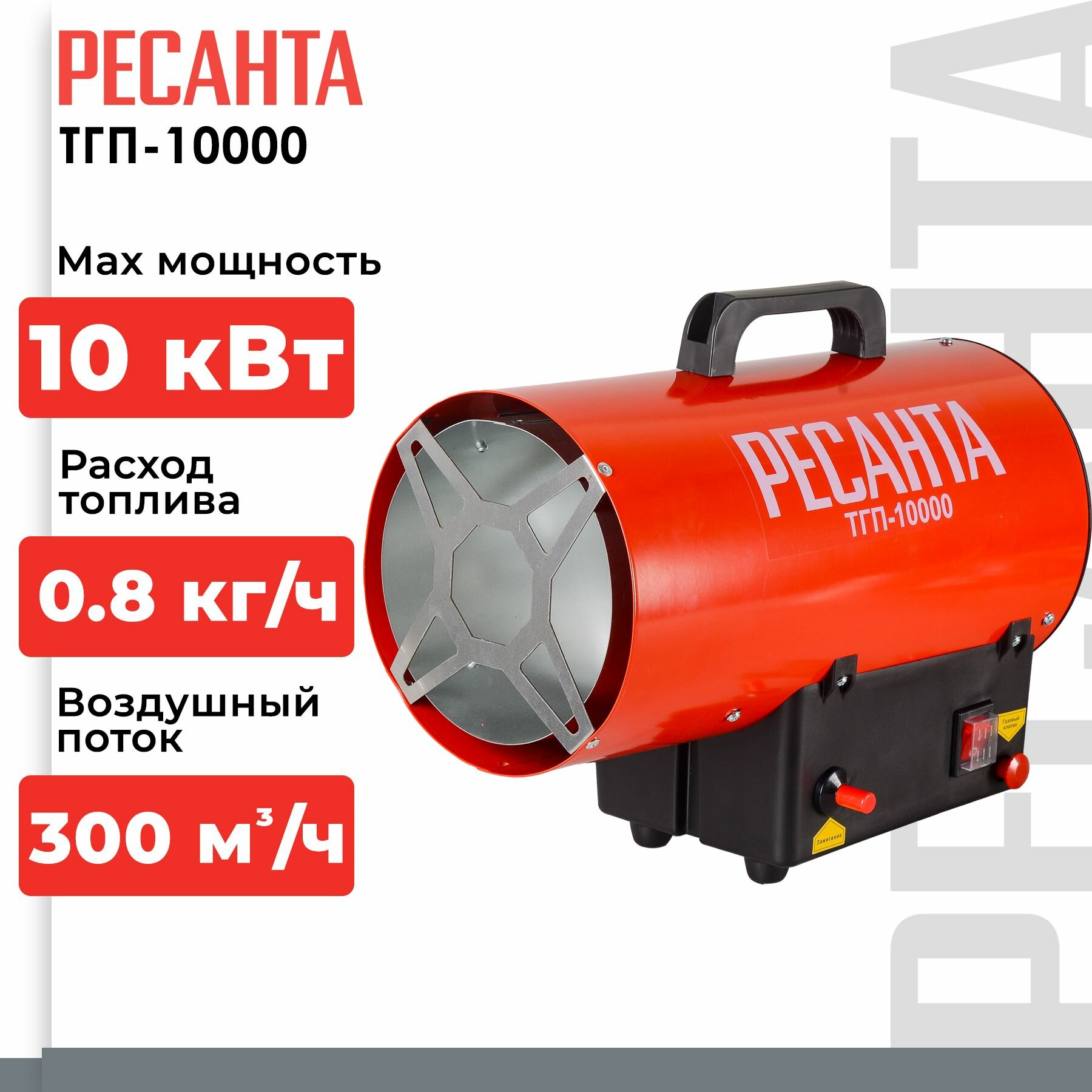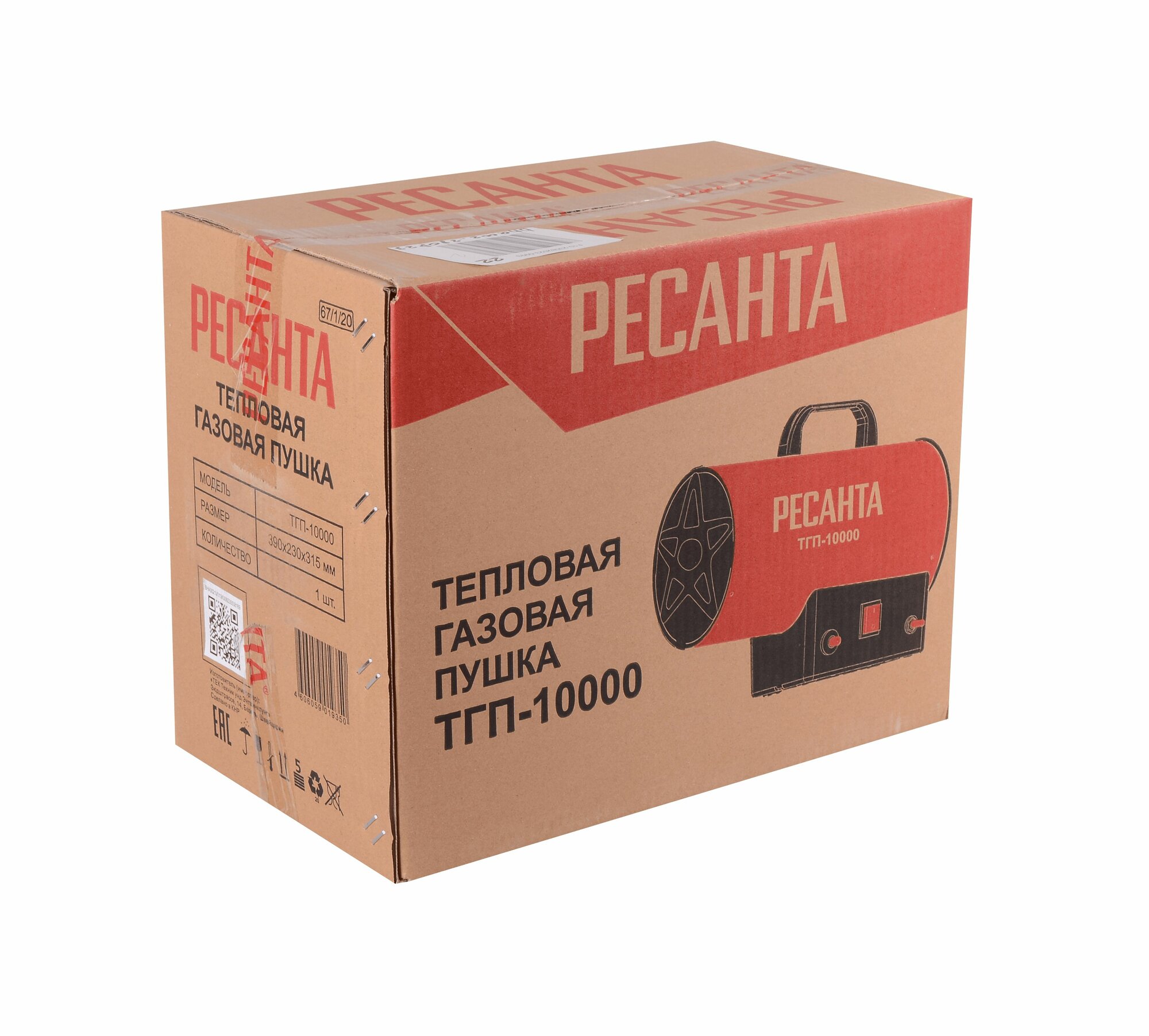 | Прочие особенности и свойства | Тепловая пушка Ресанта ТГП-10000, имеющая мощность 10 кВт, позволит быстро обогреть помещение площадью до 100 м2, а мобильное исполнение и небольшой собственный вес, составляющий менее 6 кг, делают устройство максимально удобным для транспортировки. Аппарат работает на сжиженном пропане или бутане, поставляемых в балонах, для подключения к которым в комплекте предусмотрен редуктор и соединительный шланг. Пушка абсолютно безопасна в эксплуатации и не выделяет при горении никаких вредных веществ и неприятных запахов, что делает ее пригодной для использования как в промышленных и производственных помещениях, так и в местах, где регулярно присутствует большое количество людей, например, вокзалы, аэропорты или холлы гостиниц. Присутствие в воздухе запаха при работе прибора сравнимо с обычной бытовой газовой плитой, используемой в каждом доме, при этом, чтобы его различить, необходимо находиться на небольшом удалении от устройства. Единственный момент, на который следует обязательно обратить внимание при использовании, — это наличие в помещении системы приточно-вытяжной вентиляции, а в случае ее отсутствия, открытых окон или других отверстий. Для аппарата мощностью 10 кВт желательно иметь суммарную площадь вентиляционных отверстий не менее 1 м2, кроме этого, допускается эксплуатация на открытых или полуоткрытых площадках. |