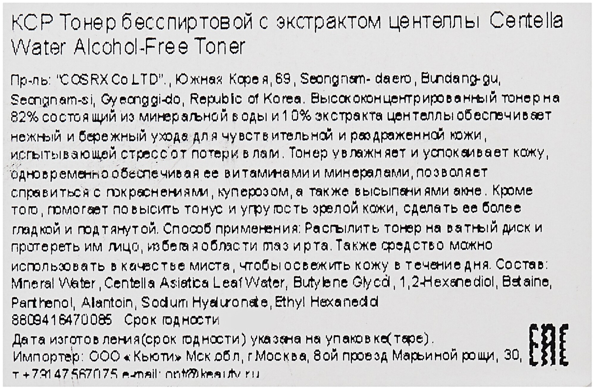 | Состав | Mineral Water, Centella Asiatica Leaf Water, Butylene Glycol, 1,2-Hexanediol, Betaine, Panthenol, Allantoin, Sodium Hyaluronate, Ethyl Hexanediol |