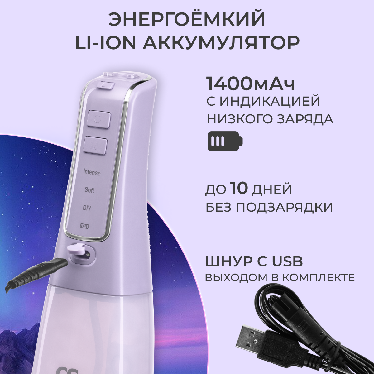 Компактный и мощный (790 кПа) ирригатор портативный. 6 насадок. Увеличенный объем резервуара (300 мл). Обслуживание в собственных сервисных центрах на всей территории РФ. Зубной ирригатор необходим для ежедневной гигиены полости рта, при ношении брекетов, имплантов, коронок. 3 режима работы: INTENSE (Интенсивный, 790 кПа), SOFT (Мягкий, 250 кПа), DIY (Do It Yourself, «Сделай это сам», 250–790 кПа) – с возможностью настройки необходимого уровня мощности. В комплекте 6 насадок: 2 стандартные, 1 ортодонтальная для ухода за брекетами, 1 пародонтальная для чувствительных десен, 1 пучковая для очищения имплантов, мостов и коронок и 1 насадка для очищения языка. Емкость аккумулятора 1400 мАч позволяет использовать прибор до 10 дней без подзарядки. Индикация низкого уровня заряда аккумулятора. Удобство подзарядки от USB-разъема компьютера через USB-кабель и от электросети с помощью адаптера. Встроенный таймер с автоотключением через 2 минуты. В комплекте твердый чехол для хранения и поездок.