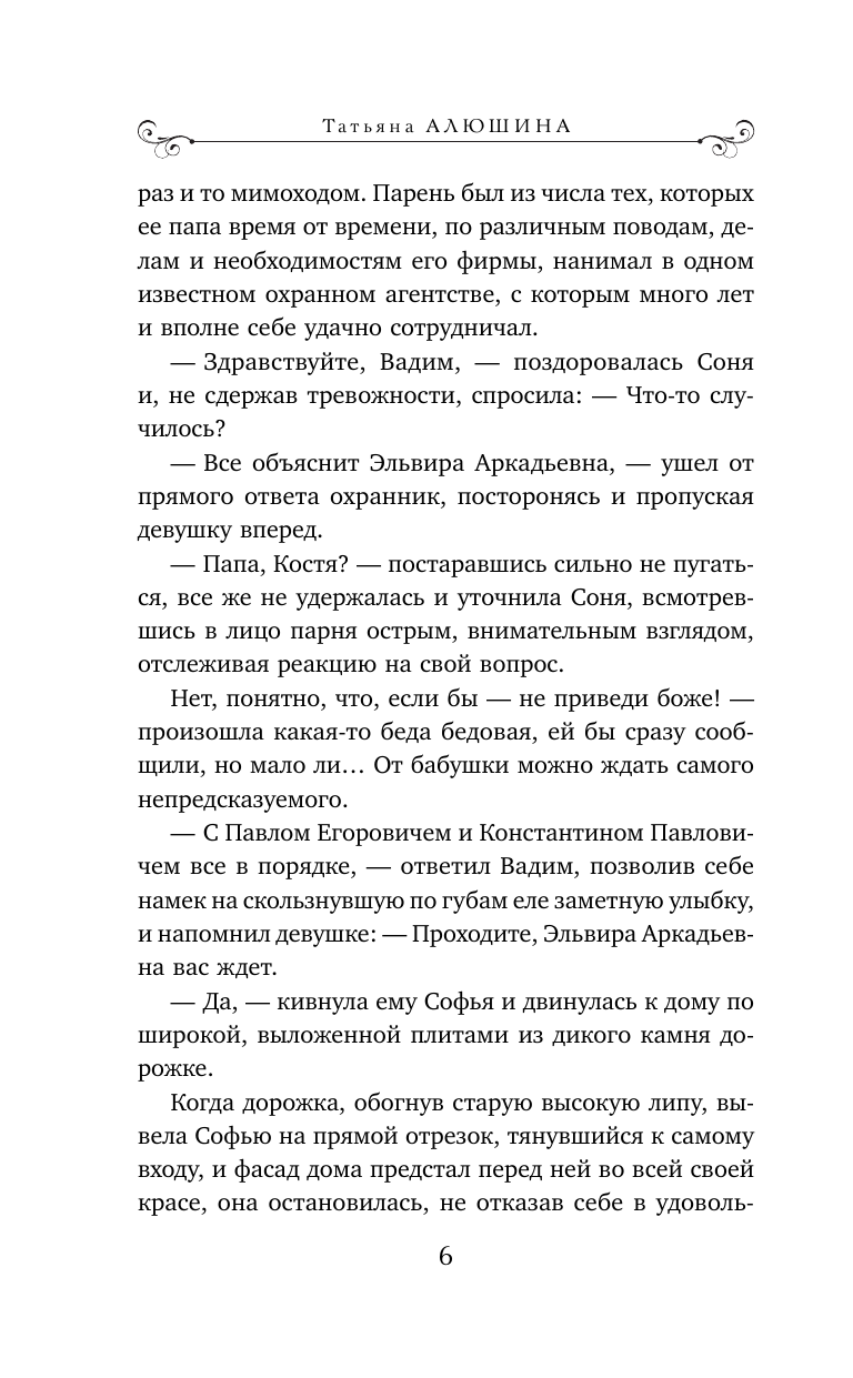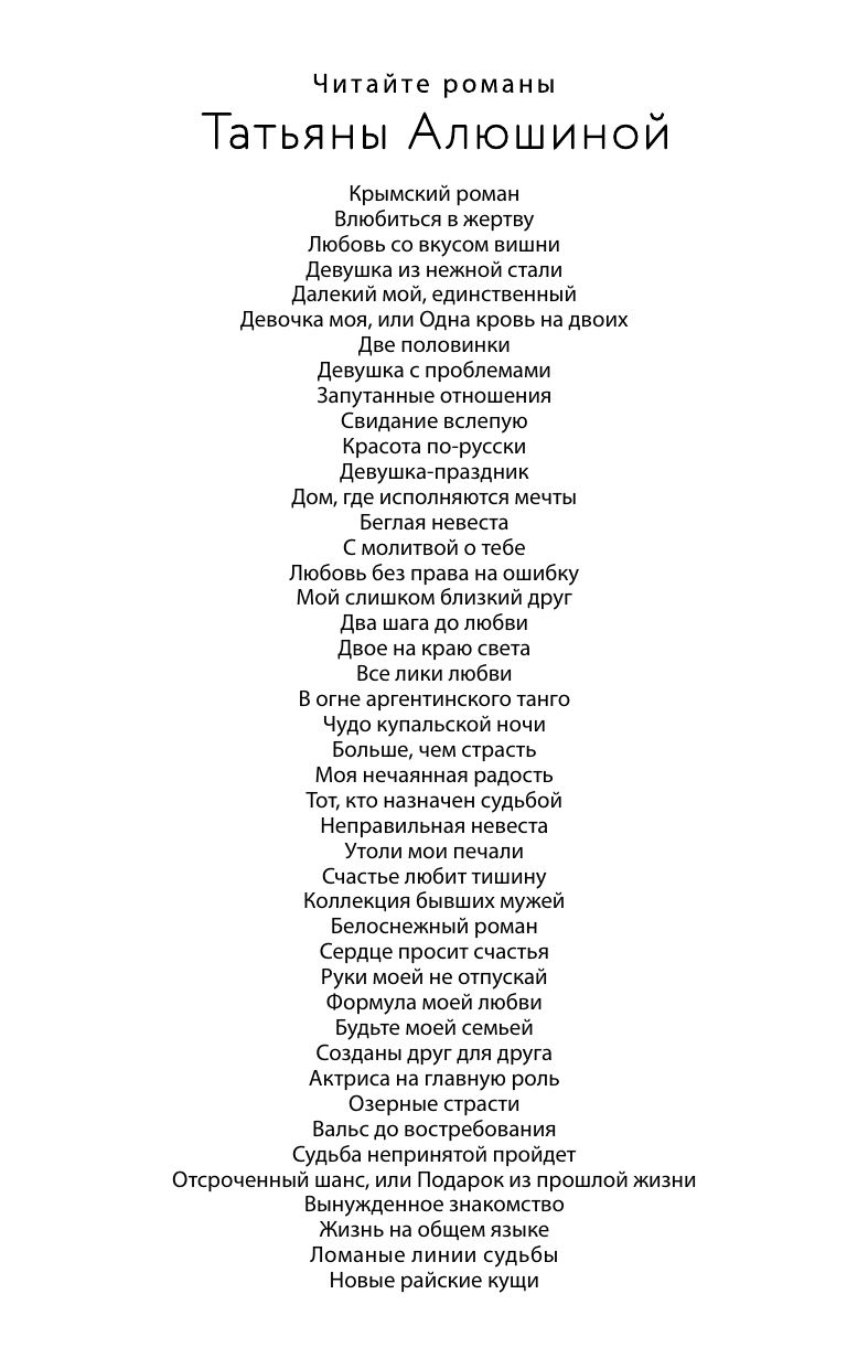 Романы Татьяны Алюшиной — это вдохновляющие истории о настоящей любви, творящейся здесь и сейчас, как будто у нас на глазах. Герои ее книг — простые люди. Кажется, что это мы сами на страницах романа: влюбляемся, ошибаемся и неустанно ищем счастья. Поэтому книги Татьяны Алюшиной завоевывают сердца и мгновенно становятся бестселлерами. Полюбите их и вы!