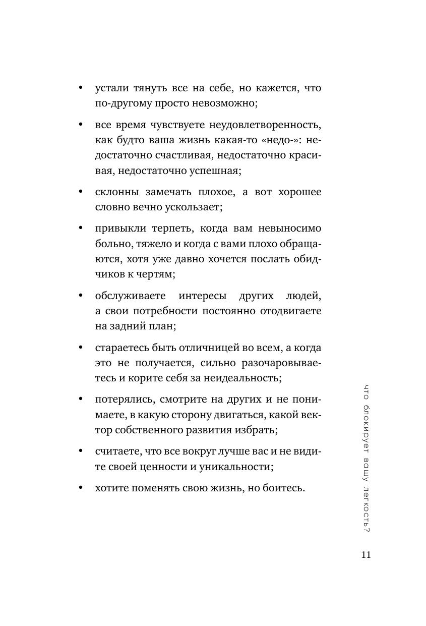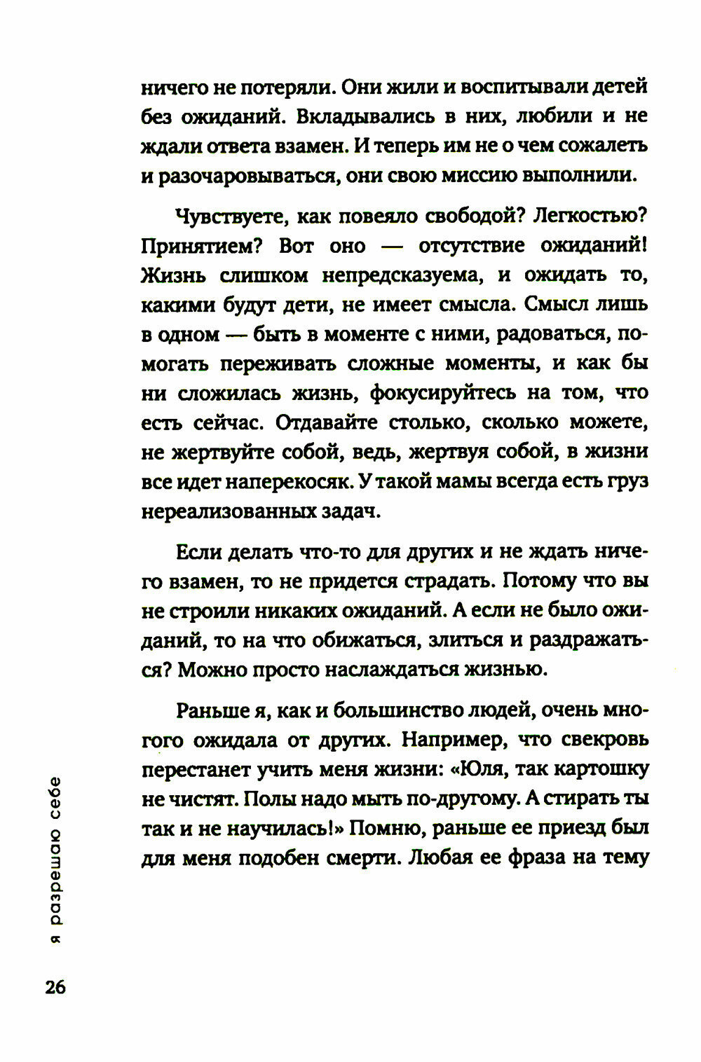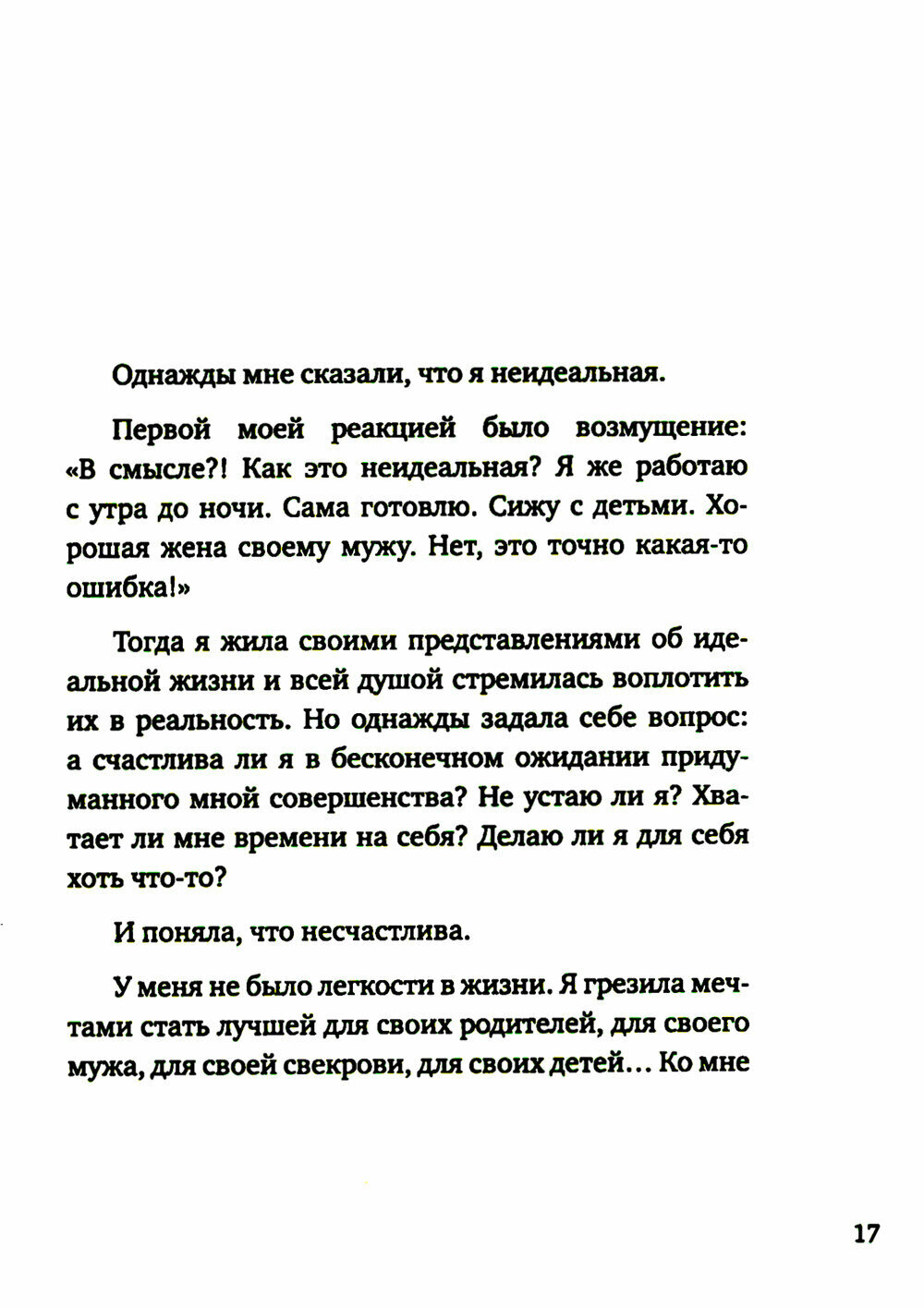 Быть супермамой, умелой хозяйкой, самой заботливой дочерью и лучшей женой, всегда прекрасно выглядеть и постоянно совершенствоваться в работе — действительно ли стремление быть во всем идеальной приближает нас к счастью или же, наоборот, только мешает его ощутить? Бизнес-психолог и популярный блогер Юлия Фурдман рассматривает в этой книге 9 препятствий, которые отделяют нас о того, что для нас по-настоящему важно и ценно, и зачастую тормозят на пути к мечте. Она показывает, как ожидания, привычка терпеть, неосуществленные планы и идеи, бесконечные надуманные «надо» и «должна», обесценивания и другие ограничивающие установки и стратегии не дают раскрыть потенциал и создать ту жизнь, которую вы себе желаете. Вы узнаете, как скорректировать общение с другими людьми и перестать ориентироваться на чужое мнение, какое отношение к проблемам позволяет не тратить энергию впустую, как проявиться, стать собой и благодаря этому двигаться по жизни более уверенно, радостно и легко.