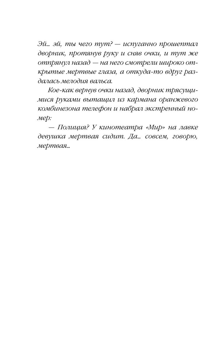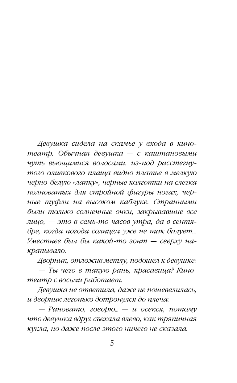 Следователь Лена Крошина расследует новое дело. Три молодые девушки обнаружены на скамейках у кинотеатров, рядом с телами плеер, из которого звучит популярная в прошлом мелодия. Они одинаково одеты и похожи друг на друга. Но как связаны с этими убийствами бывшие мужчины самой Лены – фотограф Никита Кольцов и писатель Павел Голицын, в чьем новом романе следователь, которая очень напоминает Лену Крошину, раскрывает практически такое же дело? А может, корни лежат в далеком прошлом самой Крошиной?