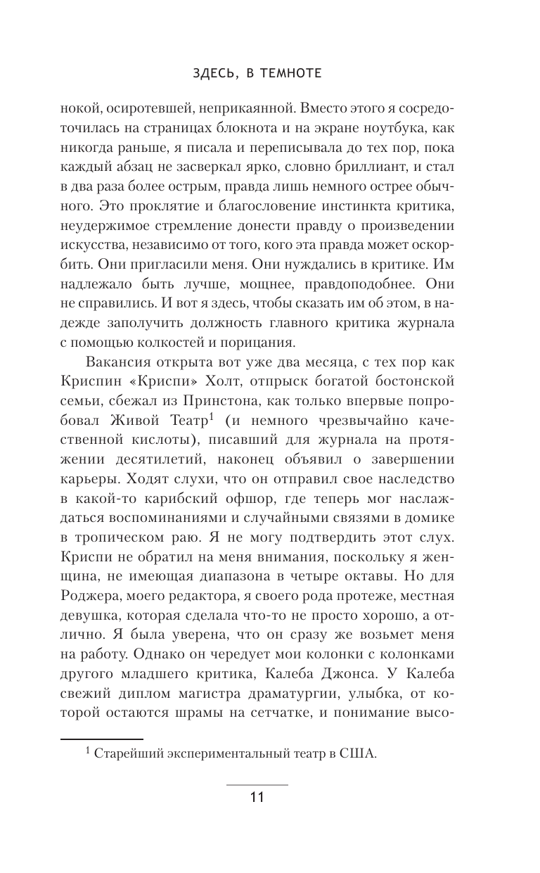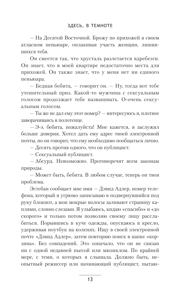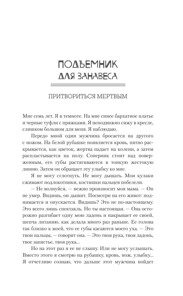 Я жива, пока не опущен занавес… Вивиан Пэрри любит темноту. Сейчас ее трудно узнать — глубоко порочна, склонна к саморазрушению, а раньше она была подающей надежды актрисой. Теперь же она театральный критик, которому приходится довольствоваться лишь едкими рецензиями для журнала. Надеясь на повышение, она соглашается на интервью со странным аспирантом, который бесследно исчезает после их встречи, поэтому Вивиан попадает под подозрение, ведь она последняя, кто видел его живым. Вивиан делает то, что обещала себе больше никогда не делать: она играет свою новую роль — роль детектива-любителя. Но чем дальше проходи расследование, тем больше она понимает, что все происходящее — постановка одержимого, но невероятно талантливого кукловода, в которой ей уготована роль жертвы. Когда границы между театром и реальным миром окончательно сотрутся, кому-то придется умереть…
