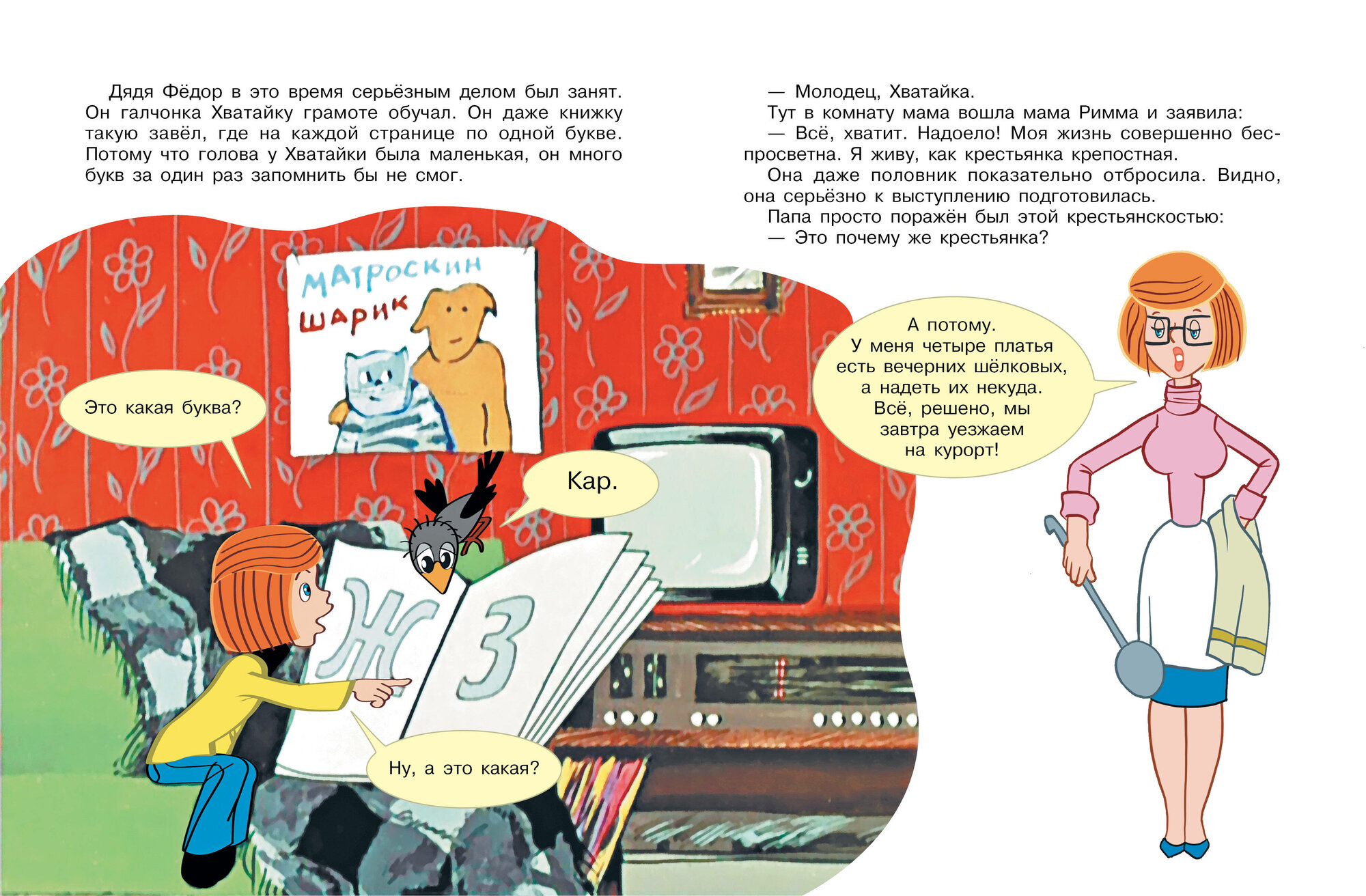 События в мультфильме развиваются не совсем так, как в повести "Дядя Фёдор, пёс и кот", зато чудесный, неповторимый голос Олега Табакова навсегда стал визитной карточкой кота Матроскина. На этот раз папа и мама дяди Фёдора отправляются на морской курорт, а мальчик сбегает от них