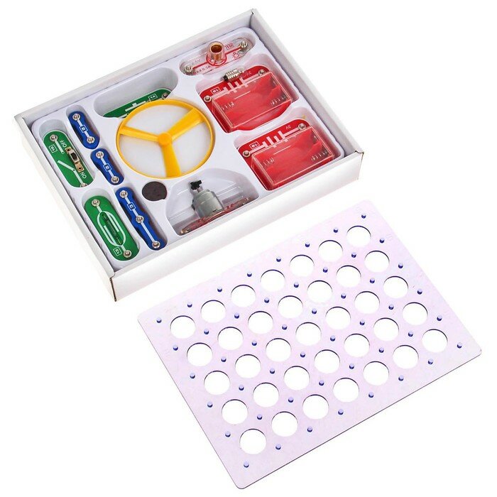 | Состав набора | провода с 2 и 3 клеммами, геркон, кнопка, выключатель, патрон для лампы на 2,5 V, батарейные отсеки, электродвигатель, пропеллер, магнит, лампа на 2,5 V, монтажная плата |