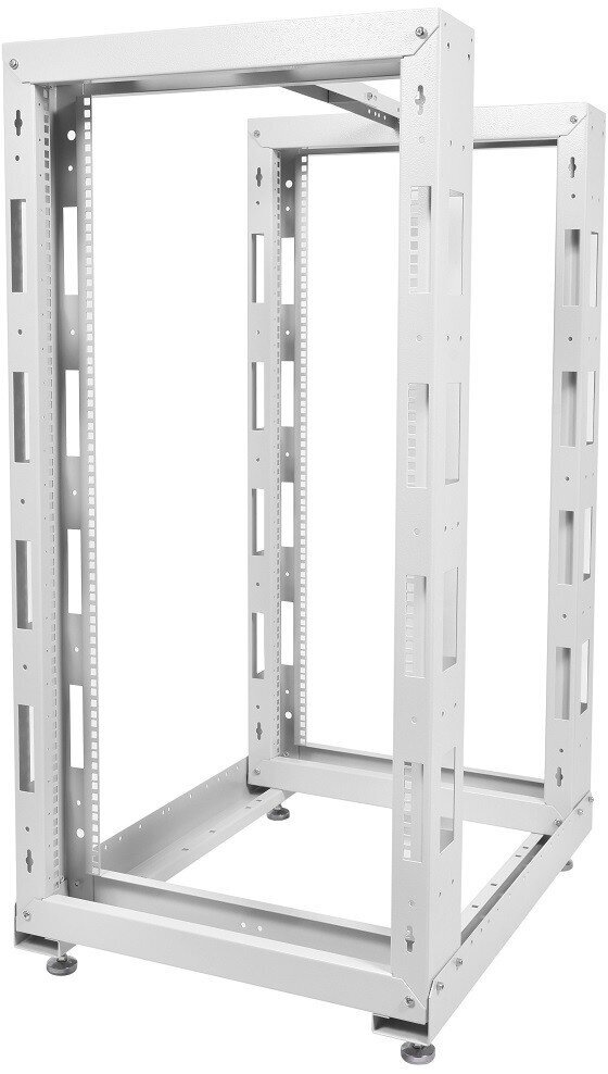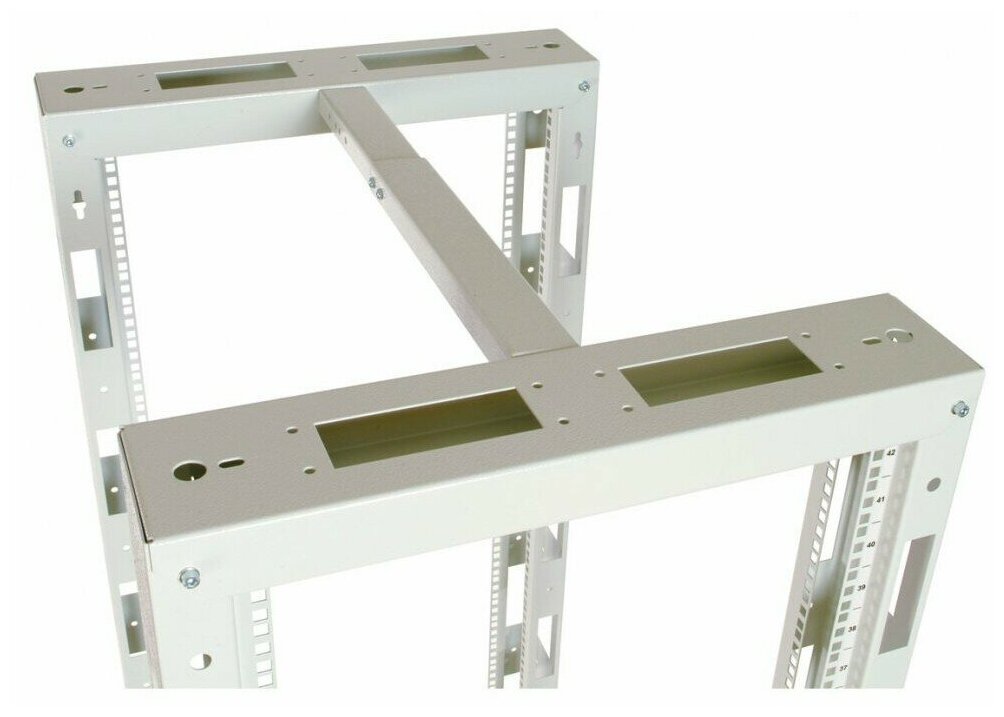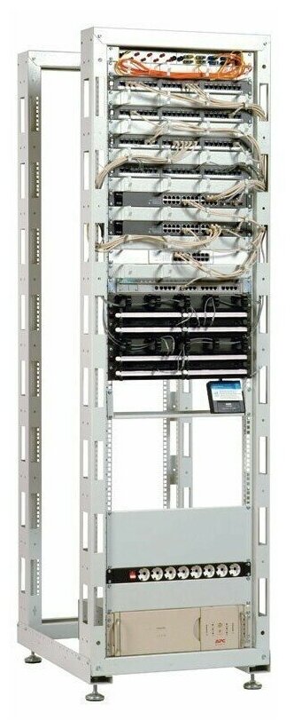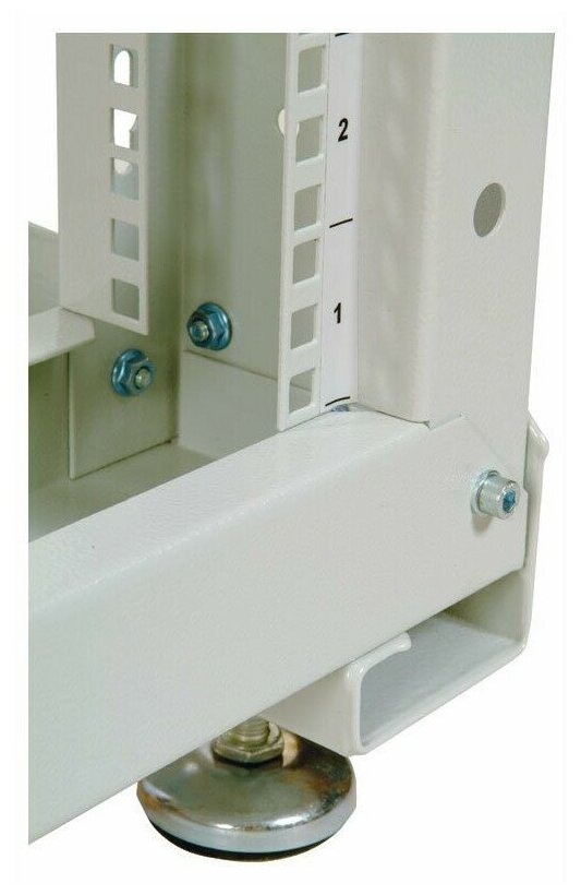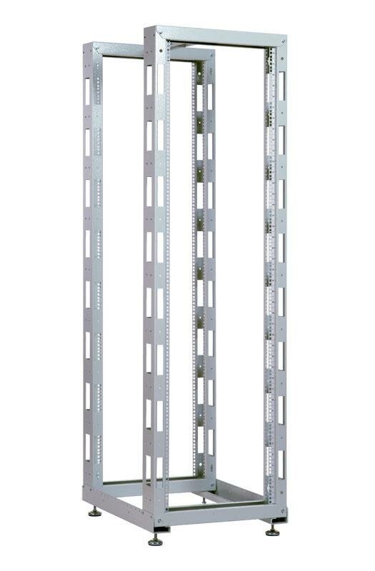Универсальные стойки 19 имеют полностью разборную двухрамную конструкцию, каркас повышенной жесткости скреплен болтами с внутренними шестигранниками. Вертикальные направляющие имеют юнитовую маркировку. Для удобства монтажа и коммутации оборудования предусмотрены развитая перфорация, широкий спектр аксессуаров и система заземления. Двухрамная универсальная стойка 19 имеет регулировку полезной глубины - 750/620/580/450. При организации крупных коммутационных узлов возможно крепление стоек между собой через вертикальный кабельный органайзер. Удобство установки обеспечивают массивные опорные кронштейны и регулируемые винтовые опоры (ножки), компенсирующие неровности пола.