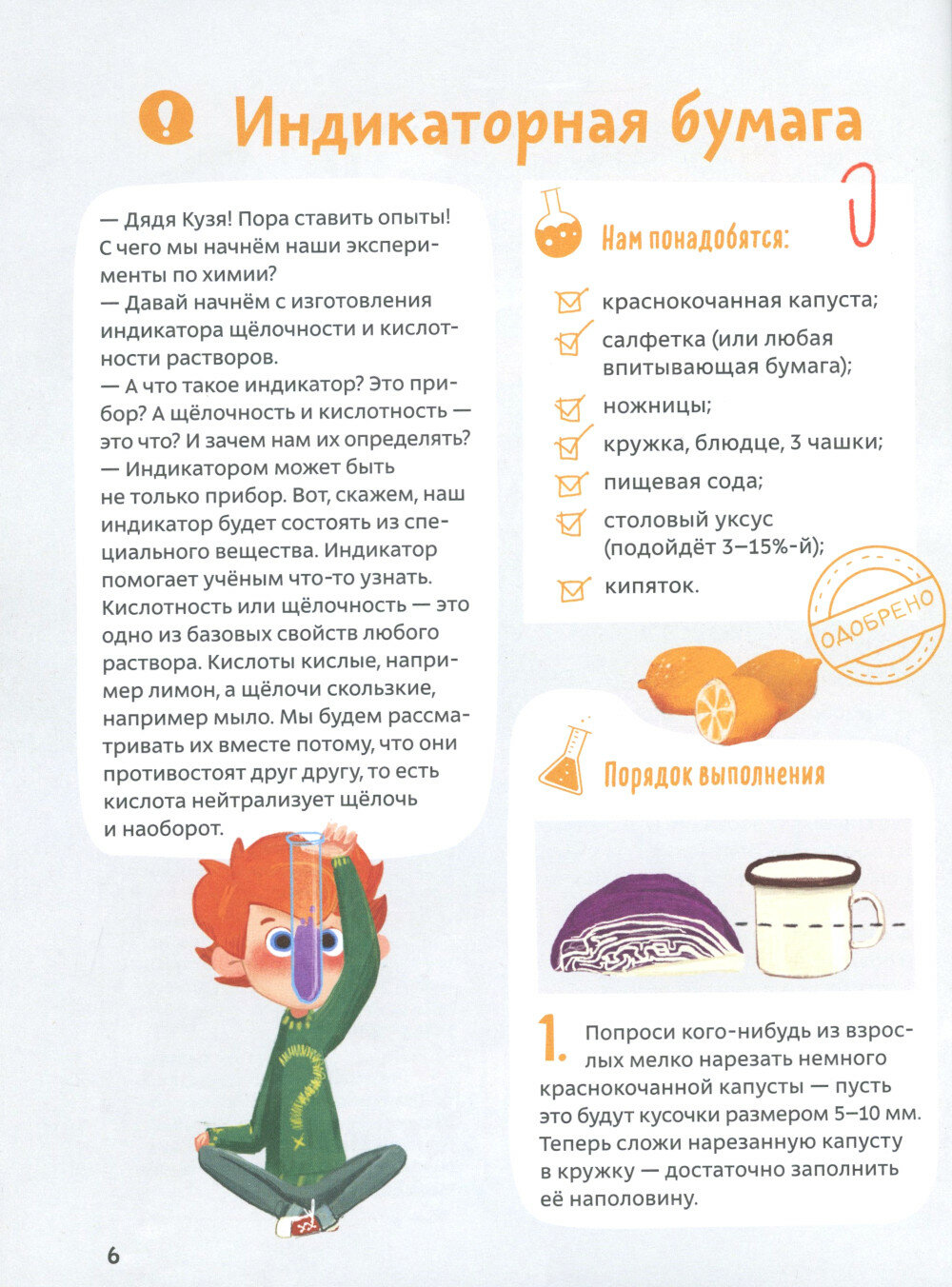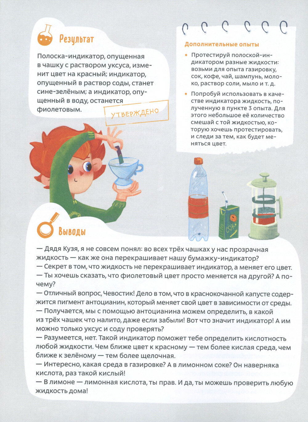 Можно ли сделать огненную змею из соды и сахара? Как вырастить кристаллы? Как очистить старинную монетку до блеска? Бывает ли лёд жидким? Юный ученый Чевостик и дядя Кузя придумали 20 простых опытов, которые помогут ребенку в игровой форме изучить законы химии и узнать природу удивительных химических явлений. Вместе с Чевостиком дети научатся писать секретные послания невидимыми чернилами, смастерят шипучую бомбочку с запахом газировки и конфет, сделают двигатель для бумажных корабликов из... обычного мыла и многое другое. Фишки книги Каждый опыт начинается с простой бытовой ситуации: прогулка, приготовление супа, купание в ванной. Оказывается, изучать химию можно даже у себя дома. Как пользоваться книгой Выбрать тему, прочитать инструкцию, поставить опыт и наблюдать Для кого эта книга Для детей от 6 лет. Для тех, кто любит Чевостика. Для тех, кто очень хочет поэкспериментировать.