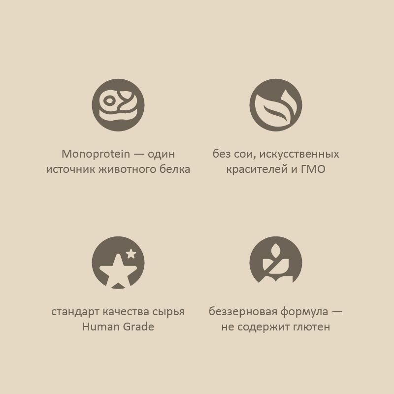 Монобелковый состав подходит питомцам при исключающей диете и снижает риск возникновение аллергических реакций.