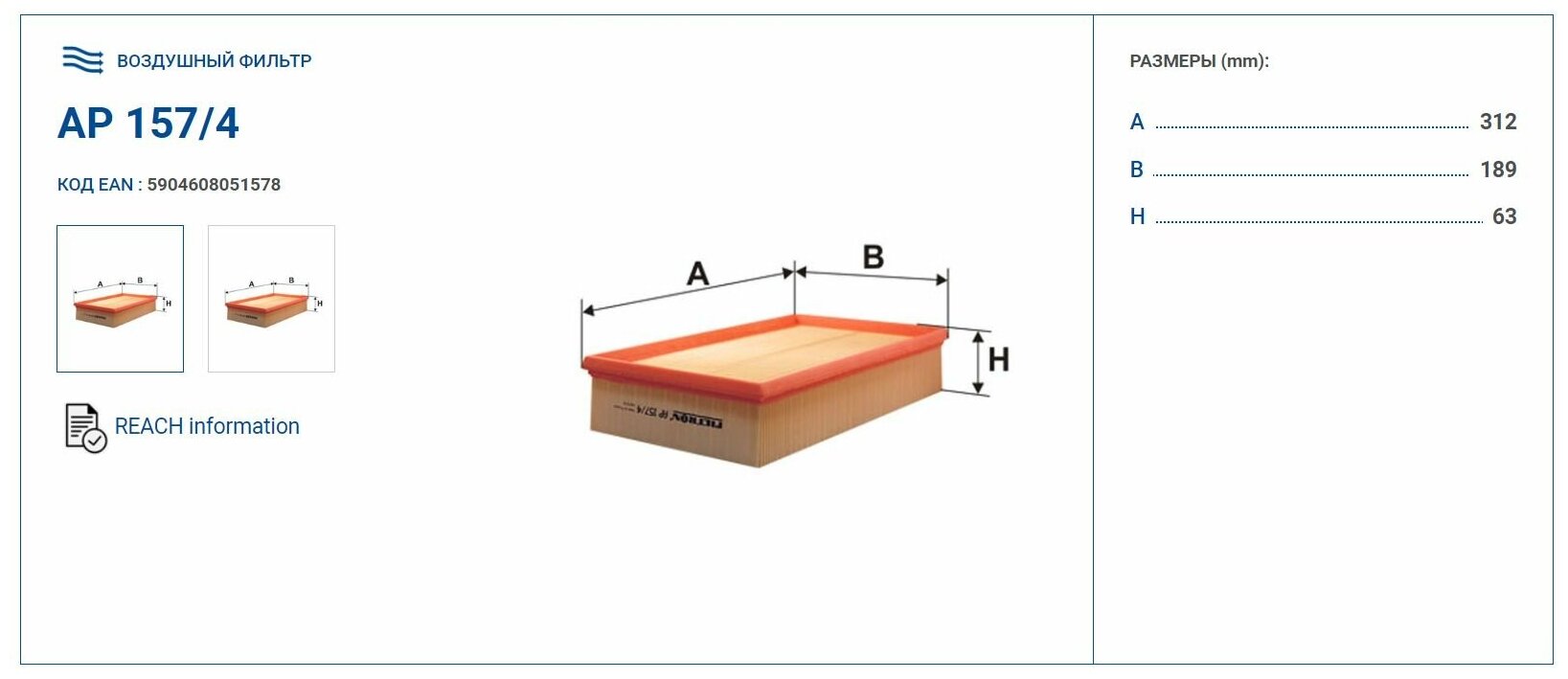 Воздушный фильтр FILTRON AP157/4 – это хороший аналог вашему оригинальному воздушному фильтру, ничем не уступающим ему по качеству.AP157/4 обеспечивает глубокую фильтрацию на уровне 99,9% для частиц пыли, размером всего в несколько микрон. Фильтр FILTRON AP157/4 в соответствии с классом F1 и S1 не поддерживают огонь и может защитить пассажиров от возгорания автомобиля в случае всасывании окурка от сигареты. Воздушный AP157/4 является эталоном качества, и прекрасно подойдет для любителей быстрой езды.Преимущества FILTRON AP157/4: - Прочные прокладка, обеспечивающая герметичность - Современные фильтрующие материалы. - Фильтрующая огнеупорная среда. - Складки стабилизированы с помощью перфорированного покрытия.Компания FILTRON рекомендует производить замену AP157/4 на 10000км пробега. Главными симптомами того, что воздушный фильтр требует замены являются потеря мощности, увеличение среднего расхода топлива, повышение рабочей температуры двигателя.Подходит для автомобилей производства VW.Является аналогом для 7H0129620, 1123210011, 1457433331, 3032000, A1169, AP157/4, C32191, CA9777, CAF100837P, E587L, LX786, P436, 3012906207H0, 32191LFPCSMS, LA1018, K724, MA1357, AG233, A140466, F203701, 70279, 60811, ELP9071, FAI244.