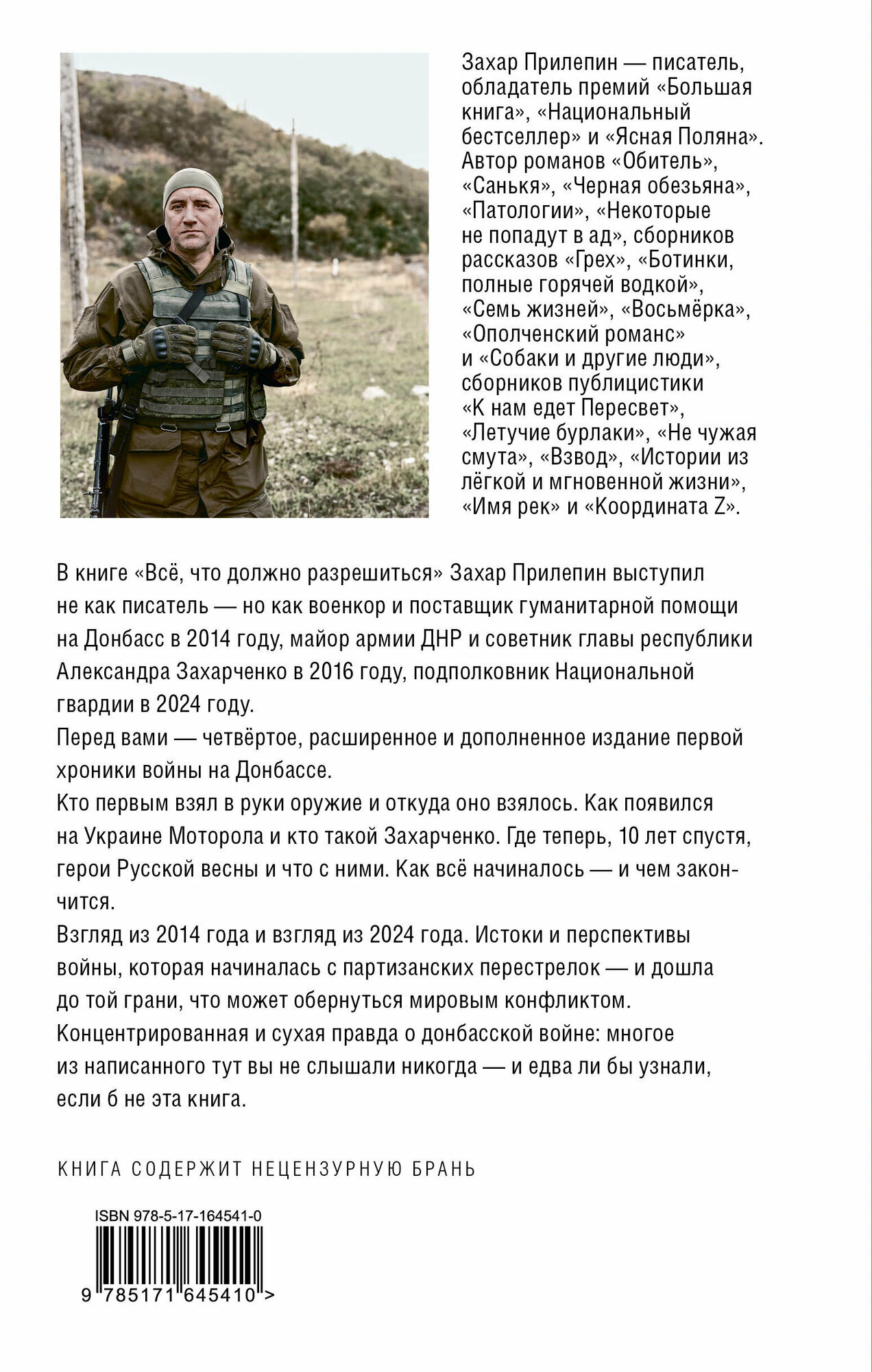 В книге "Всё, что должно разрешиться" Захар Прилепин выступил не как писатель — но как военкор и поставщик гуманитарной помощи на Донбасс в 2014 году, майор армии ДНР и советник главы республики Александра Захарченко в 2016 году, подполковник Национальной гвардии в 2024 году.