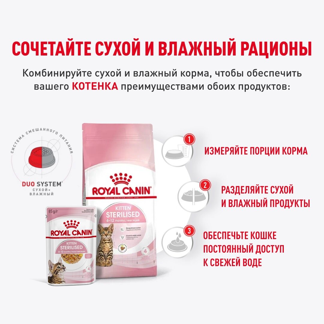 Киттен стерилайзд: влажный корм для стерилизованных котят в возрасте от 6 до 12 месяцев. Уже через 48 часов после стерилизации у кошки может существенно возрасти аппетит, что приведет к набору избыточного веса. Умеренная калорийность продукта Киттен стерилайзд позволяет избежать набора избыточного веса, а оптимальное количество белков и минеральных веществ поддерживает здоровый рост котенка. Проследите, чтобы у вашей кошки всегда была свежая вода. Номер серии и срок годности указаны на упаковке. Хранить в сухом, прохладном месте.