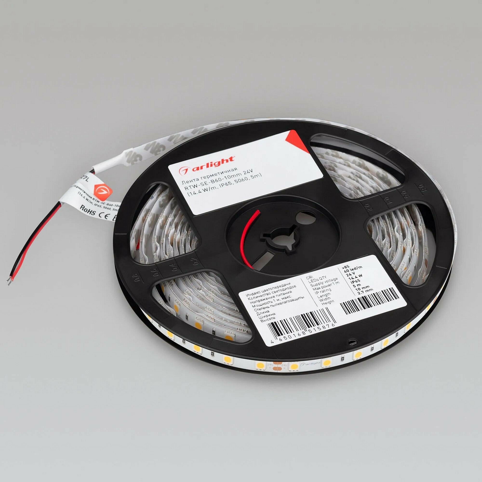 Светодиодная лента RTW-SE-B60, герметичная IP65 (SE-силиконовый верхний слой). Светодиоды 5060, 60 шт/м (300 шт на 5 м), белая плата, ширина 10 мм, скотч 3M. Цвет ТЁПЛЫЙ 3000 K, цветопередача CRI>85, угол 120°. Питание 24V, мощность 14.4 Вт/м (72 Вт на 5 м). Размеры 5000x10x2.7 мм. Мин. отрезок 100 мм, 6 светодиодов. Цена за 1 м.