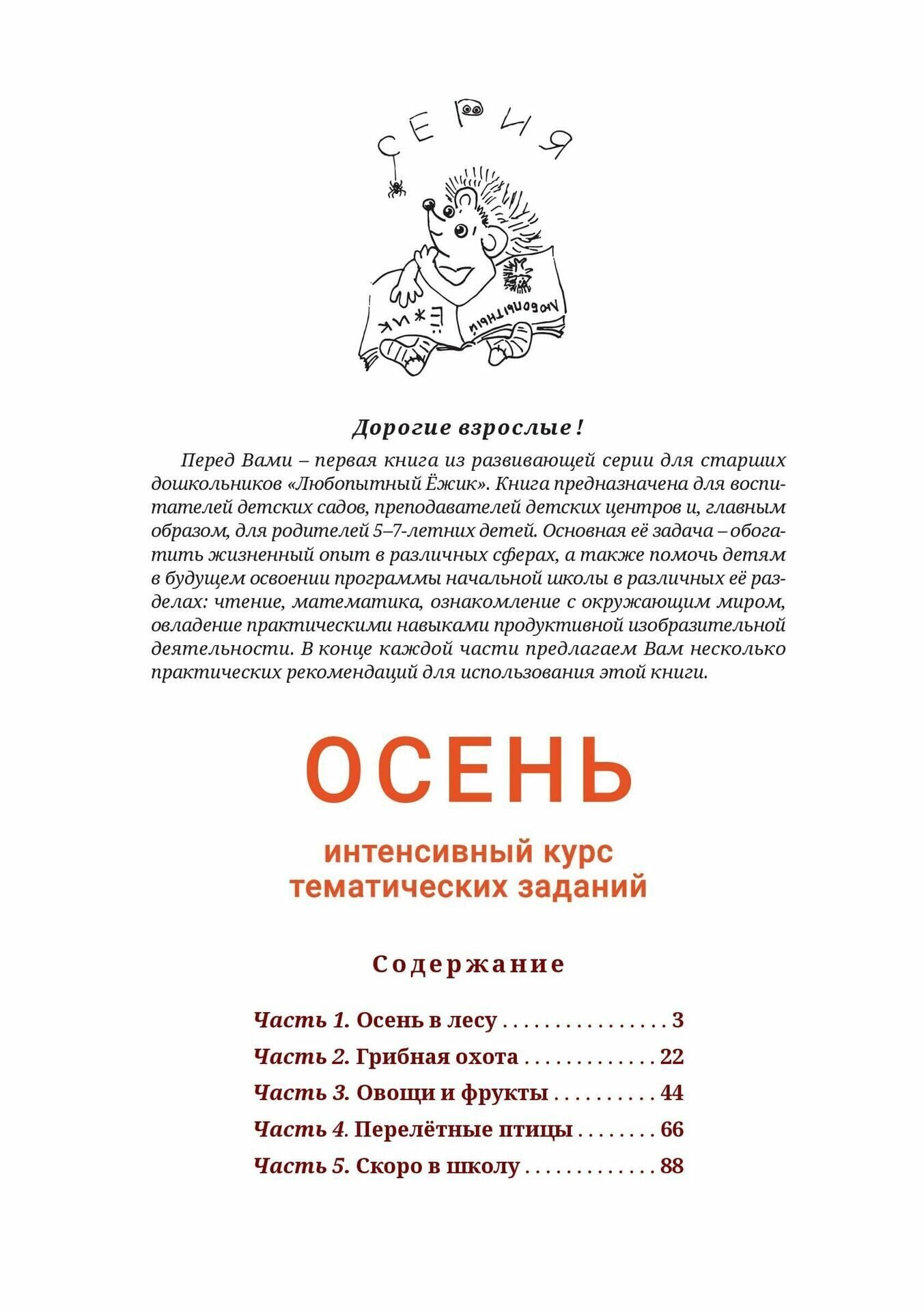 Книга подробно раскрывает осенние темы: «Осень в лесу», «Грибы», «Овощи и фрукты», «Перелетные птицы», «Скоро в школу». Задания имеют разный уровень сложности и охватывают весь спектр занятий дошкольника: развитие речи, овладение чтением, ознакомление с окружающим миром, начала математики и логики, а также поэтапное выполнение оригинальной поделки и несложного рисунка. В конце каждой части предлагаются практические рекомендации для выполнения заданий.