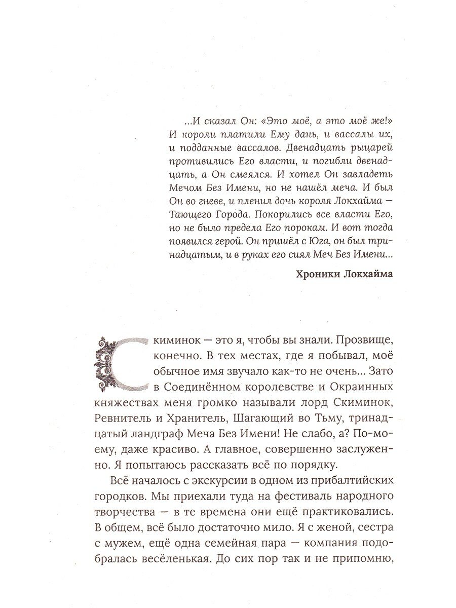 Эта фантастическая история, полная опасных приключений, произошла в наши дни. Герой романа, двадцатисемилетний художник Андрей, волею неведомых сил становится избранником волшебного Меча и попадает в параллельный мир. Он должен освободить жителей Срединного королевства от власти могущественного колдуна Ризенкампфа. Герой не прячется от опасностей. На своём пути он стремится помочь каждому попавшему в беду. И вскоре у него появляются храбрые и верные друзья. Вместе они одолевают злых ведьм и коварных монахов, спускаются в ад и находят новых союзников - чертей. Чего только им не суждено было пережить! Неизменный юмор и отвага ведут их к цели - злой колдун будет уничтожен.