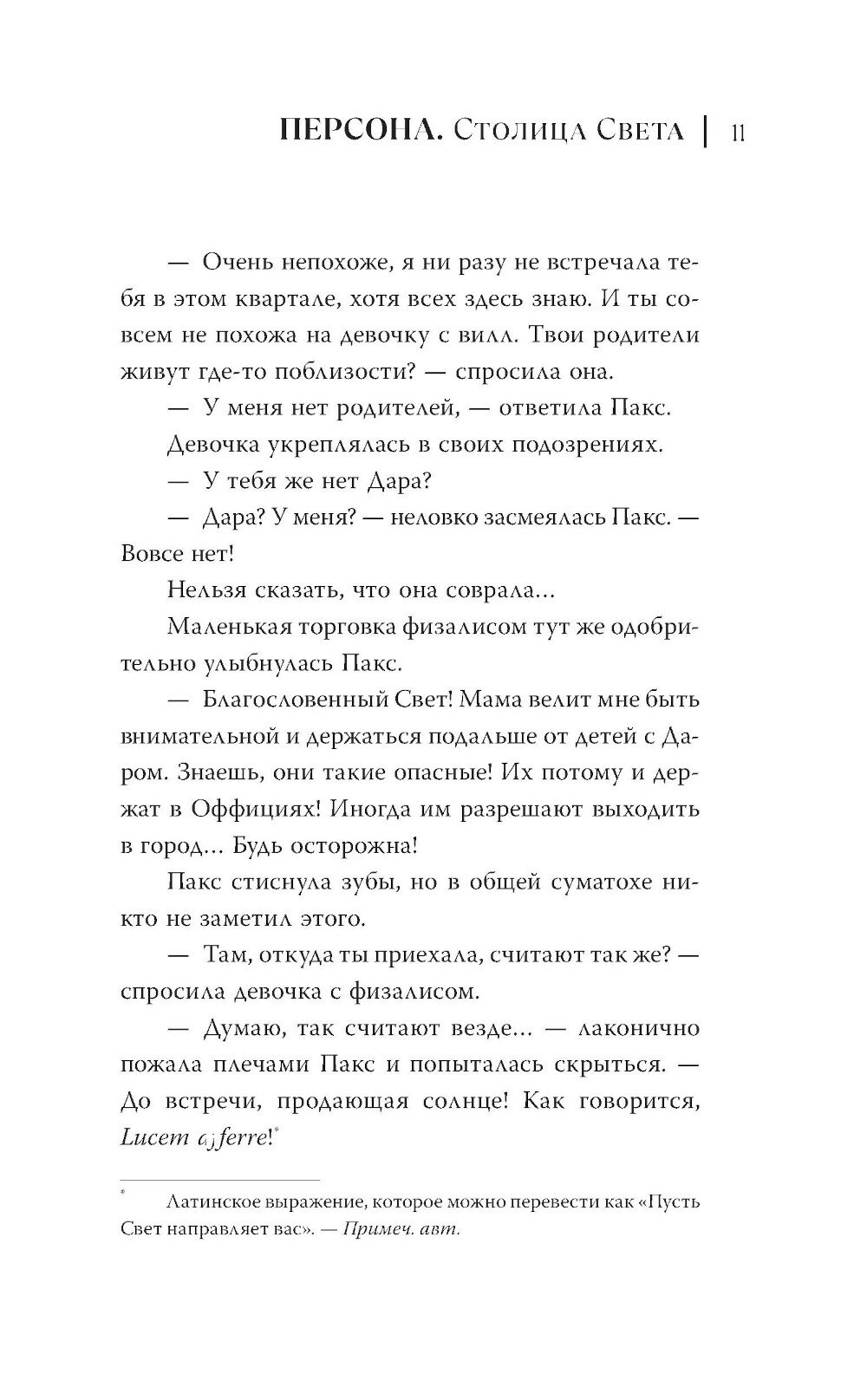 В государстве Люкс есть дети, которых коснулся Свет. Каждый из них обладает уникальным магическим Даром. Достигнув совершеннолетия, они встают перед судьбоносным выбором - отказаться от Дара и обрести свободу, или отказаться от нее, став служителями культа Света. Андреа - Персона. Его дар не просто скрываться под ликом другого человека, а становиться им. В тот день, когда Андреа доверяют загадочную миссию, у всех детей Света появляется шанс изменить ход судьбы. Своей и всего окружающего их мира. Первая книга цикла. Для широкого круга читателей.