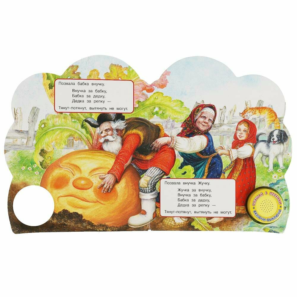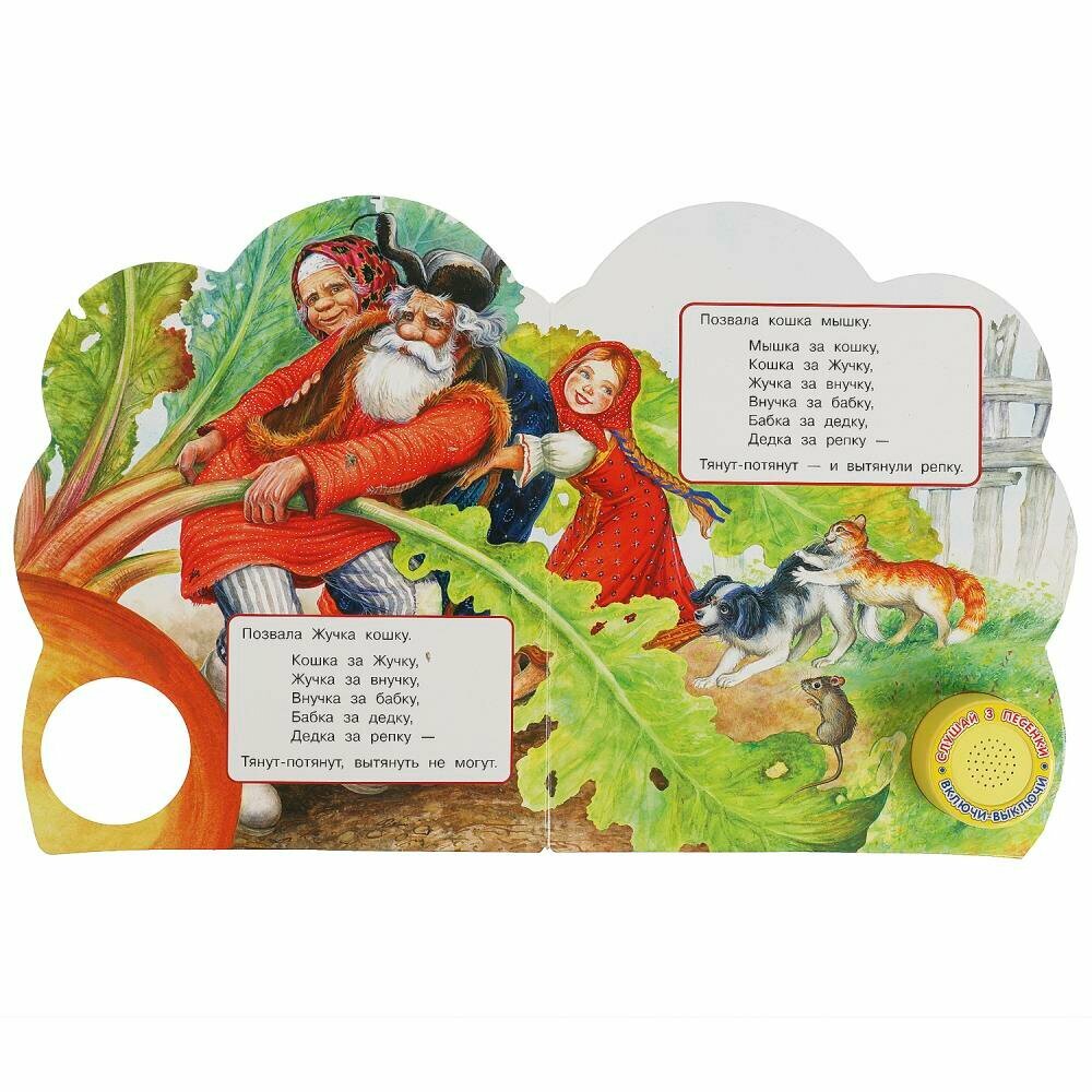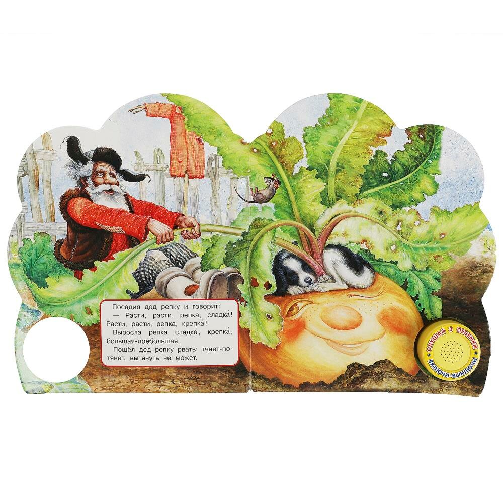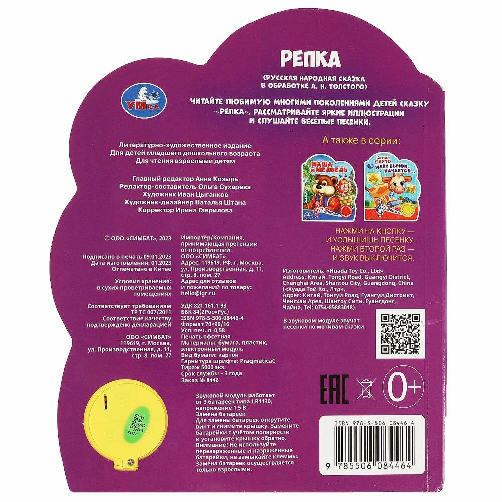 Музыкальная книга «Репка» ТМ «УМка» станет прекрасным подарком для малыша:- 1 звуковая кнопка- 3 песенки по мотивам сказки- любимая сказка в обработке А. Н. Толстого- красочные иллюстрации- фигурная вырубкаРебёнок с удовольствием будет листать плотные страницы, рассматривать красочные картинки, вместе с родителями читать известную сказку и, конечно, нажимать на кнопку и слушать весёлые песенки. Малыш легко освоит включение звука: по нажатию на кнопку песенка включится, при втором нажатии выключится, при третьем - заиграет следующая композиция. Благодаря компактному размеру книгу удобно взять с собой в дорогу.Музыкальная книга ТМ «УМка» развивает:- слуховое восприятие- навык чтения- фантазию- образное мышление- памятьОбъём: 8 стр. Формат: 152 х 185 см.Материал: пластмасса + картон.Работает от 3-х батареек типа LR44 (в комплекте).Рекомендовано детям младшего дошкольного возраста.