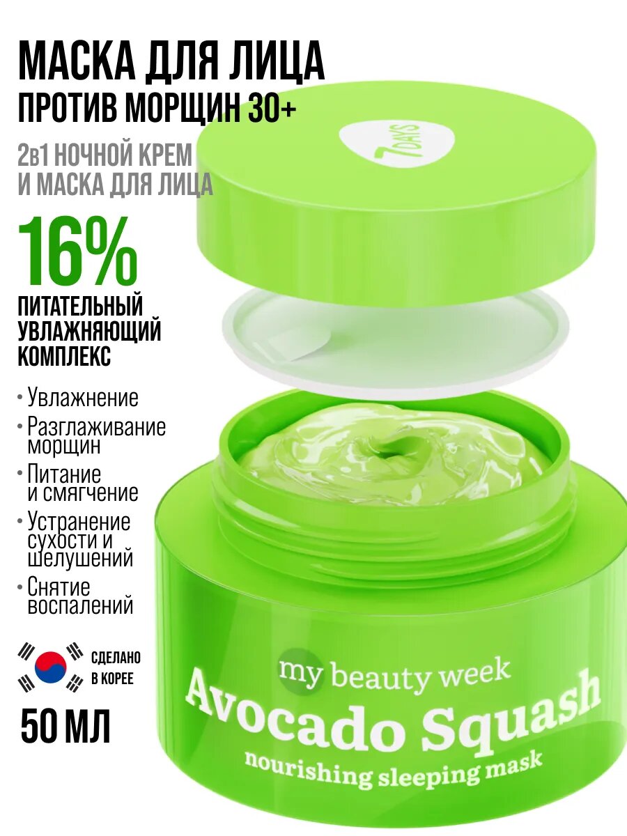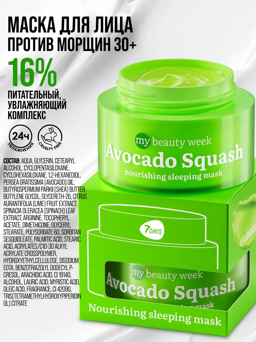Маска для лица AVOCADO SQUASH (масло ши, масло авокадо) - экстра питание, лифтинг для лица, SMART уход за лицом (Корея). Корейская косметика женская 2в1 - настоящий мастхэв для сухой кожи: можно использовать как увлажняющую маску для лица от морщин или питательный крем для лица (ночной крем). Как маска для лица обеспечивает питание, сияние и увлажнение лица.Маска для лица корейская содержит только эффективные компоненты для ухода за лицом: масло Авокадо лифтинг для лица и свежий вид, экстракт Лайма сияние и омоложение, экстракт Нима и масло Ши от морщин на лице, увлажнение.Как крем для лица питательный помогает коже вырабатывать коллаген и придает упругость. Так же можно использовать как крем для лица увлажняющий для ночного ухода за кожей.Нас также ищут 7Days косметика корейская, уход за лицом, маски для лица корейские, женская косметика. Может использоваться в качестве подарка: маме (мамочке), бабушке (бабуле), девушке, парню (для него), подруге (для нее), жене или коллеге на 8 марта (международный женский день), 23 февраля, 14 февраля (День Святого Валентина), Новый год (НГ) или сюрприз на день рождения (ДР), день матери, день всех влюбленных, на юбилей, женщине, дедушке, любимой, для любимого, мужчине, мужу, девочке, мальчику, на свадьбу, на годовщину, свекрови, папе (для отца), брату, сестре, воспитателю, учителю (преподавателю), врачу (доктору), подростку, на праздник, на выпускной, другу (для друзей), дочке, сыну, на новоселье, тете, шефу, начальнице (начальнику), теще, для семьи, новогодний сюрприз, на пасху.