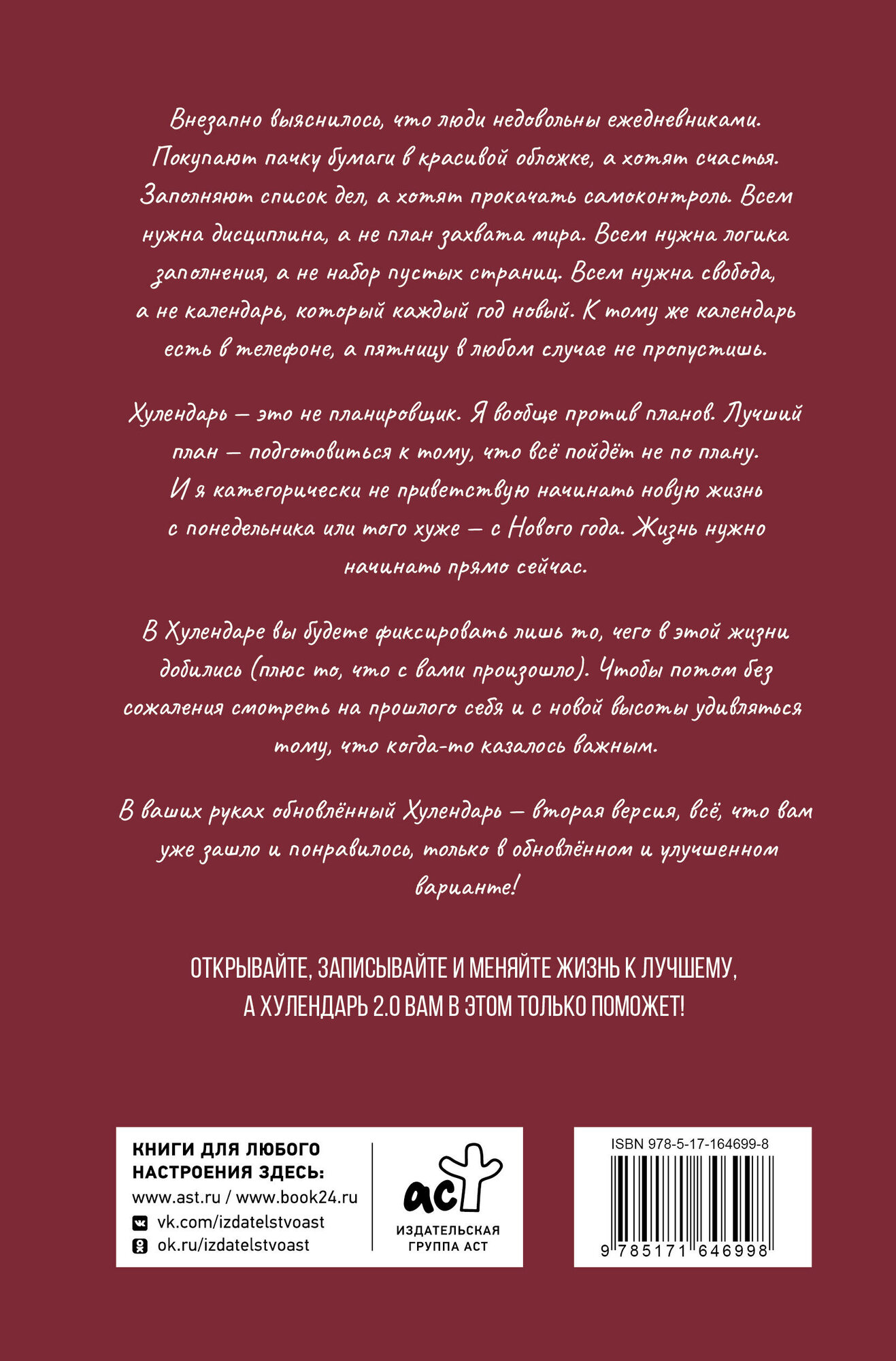 Внезапно выяснилось, что люди недовольны ежедневниками. Покупают пачку бумаги в красивой обложке, а хотят счастья. Заполняют список дел, а хотят прокачать самоконтроль. Всем нужна дисциплина, а не план захвата мира. Всем нужна логика заполнения, а не набор пустых страниц. Всем нужна свобода, а не календарь, который каждый год новый. К тому же календарь есть в телефоне, а пятницу в любом случае не пропустишь.Хулендарь — это не планировщик. Я вообще против планов. Лучший план — подготовиться к тому, что всё пойдёт не по плану. И я категорически не приветствую начинать новую жизнь с понедельника или того хуже — с Нового года. Жизнь нужно начинать прямо сейчас. В Хулендаре вы будете фиксировать лишь то, чего в этой жизни добились (плюс то, что с вами произошло). Чтобы потом без сожаления смотреть на прошлого себя и с новой высоты удивляться тому, что когда-то казалось важным.Думайте и провоцируйте себя на великие свершения!