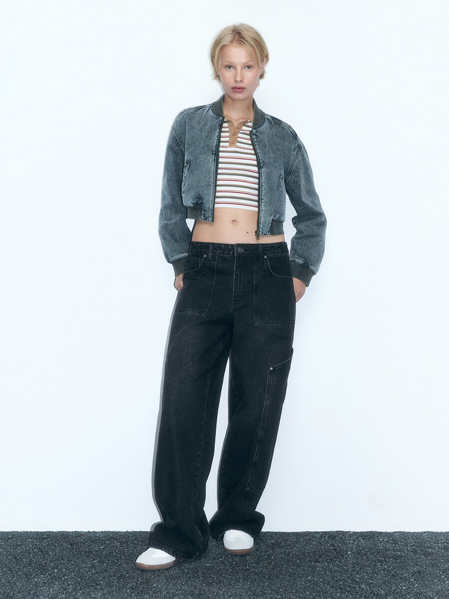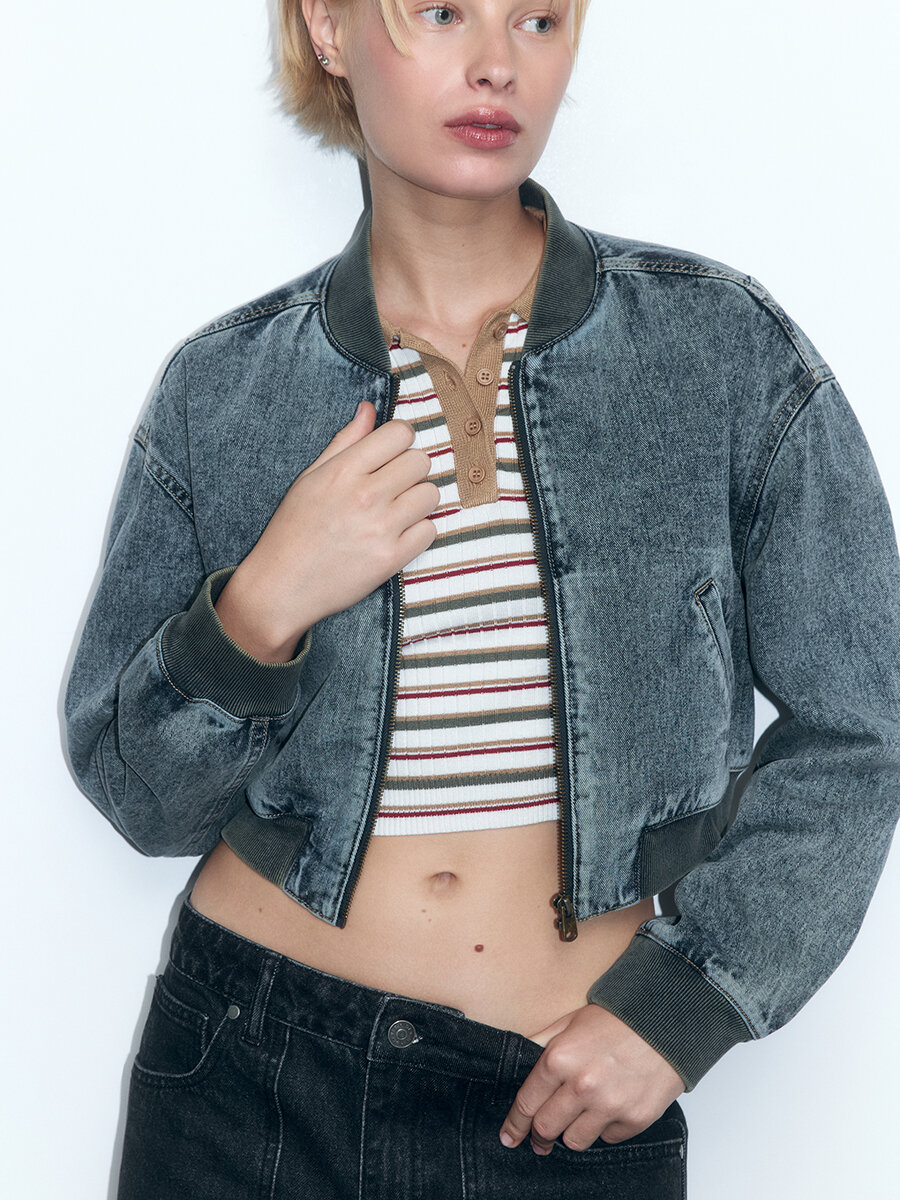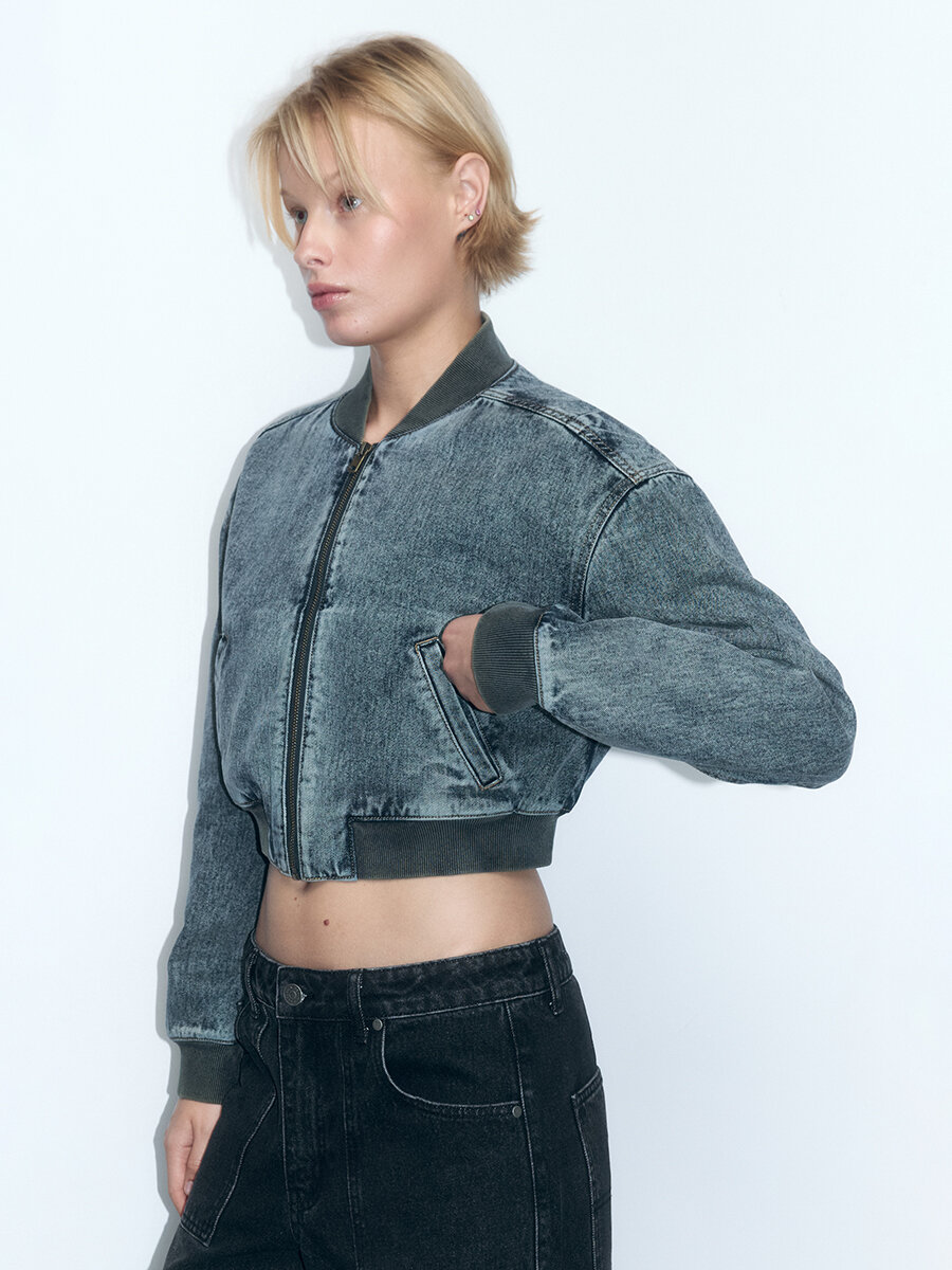 - Укороченный женский бомбер свободного кроя из плотного, легкого хлопкового денима с добавлением вискозы