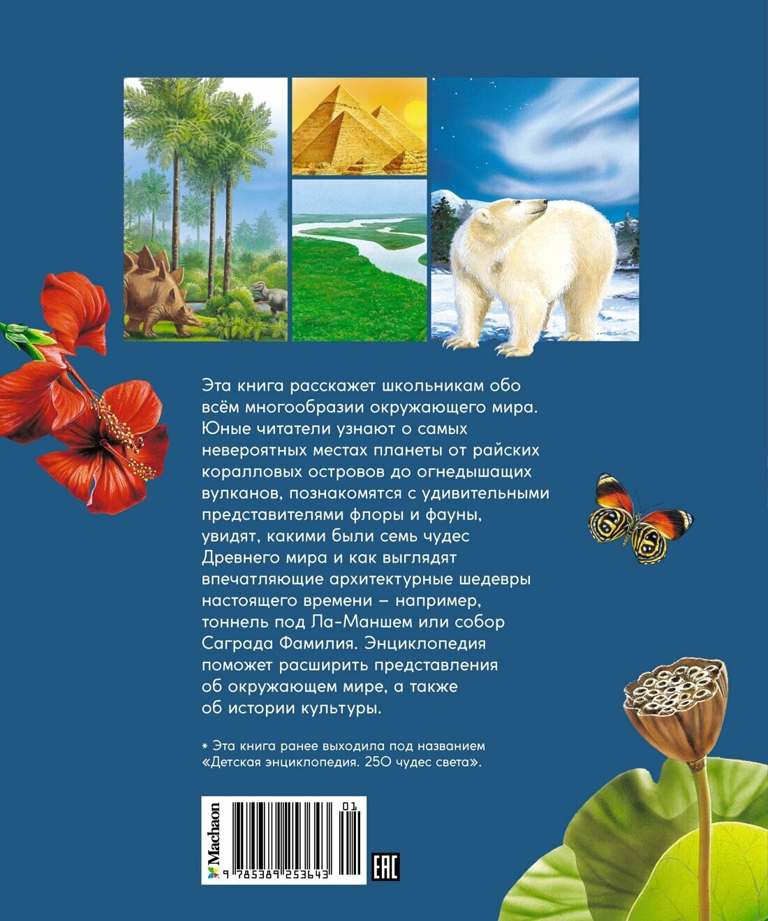 Эта книга расскажет школьникам обо всём многообразии окружающего мира. Юные читатели узнают о самых невероятных местах планеты от райских коралловых островов до огнедышащих вулканов, познакомятся с удивительными представителями флоры и фауны, увидят, какими были семь чудес Древнего мира и как выглядят впечатляющие архитектурные шедевры настоящего времени например, тоннель под Ла-Маншем или собор Саграда Фамилия. Энциклопедия поможет расширить представления об окружающем мире, а также об истории культуры.