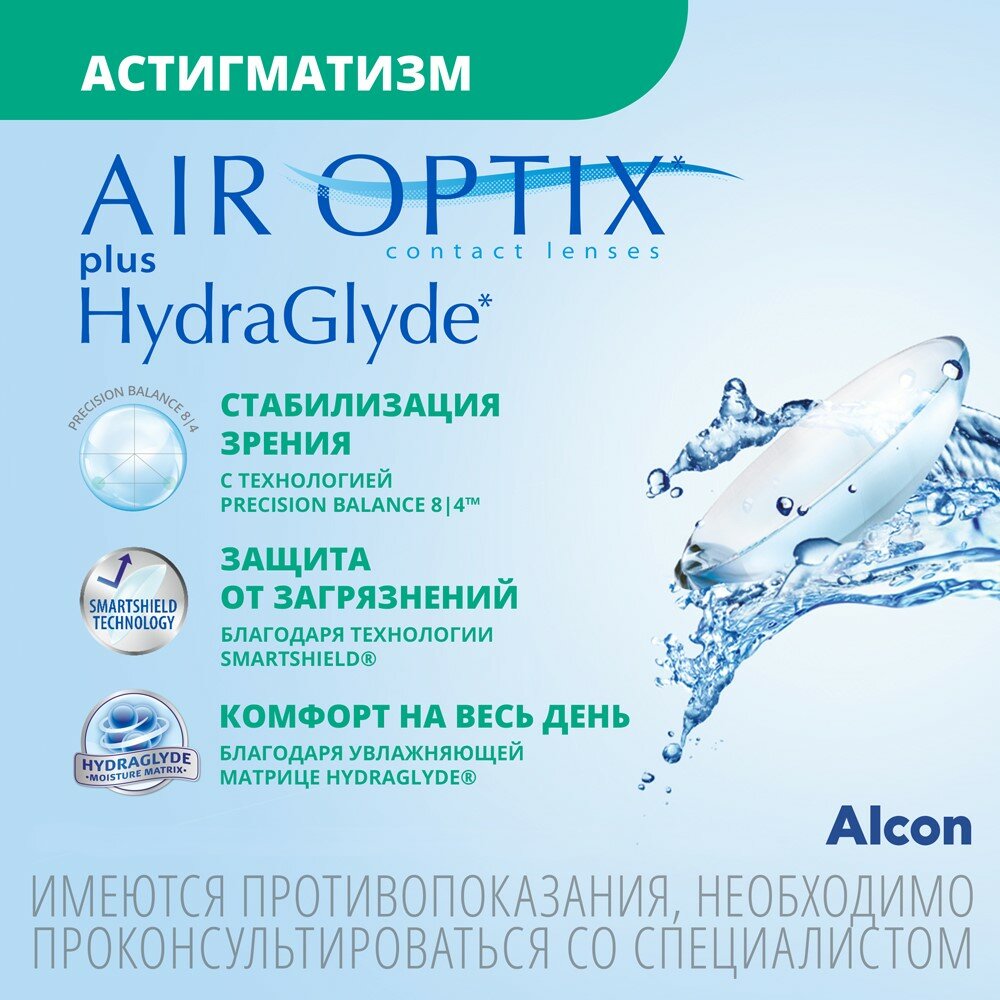 Мягкие силикон-гидрогелевые контактные линзы плановой замены для людей с астигматизмом (1 месяц ношения).Линзы Alcon Air Optix plus HydraGlyde for astigmatism обеспечивают комфорт и четкое зрение для людей с астигматизмом. Особая форма позволяет линзе всегда оставаться на месте, а матрица HydraGlyde обеспечивает увлажнение и комфорт в течение всего срока ношения.Ключевые особенности Air Optix plus HydraGlyde for astigmatizm1.Четкое зрениеДизайн Precision Balance 8|4 стабилизирует положение линзы на глазу, чтобы предотвратить «размывание» изображения. Технология учитывает естественный механизм моргания для сохранения стабильности линзы на глазу, для стабильно высокого качества зрения.2.Технология защиты поверхности SmartShield - уникальная технология плазменной обработки поверхности линзы, которая обеспечивает:•Высокую устойчивость к загрязнениям.•Устойчивость к воздействию косметических средств – крема для рук, средств для снятия макияжа.•Устойчивость к туши для ресниц, в том числе водостойкой.3.Увлажняющая матрица HydraGlyde обеспечивает:Длительное удержание влаги на поверхности линзы.