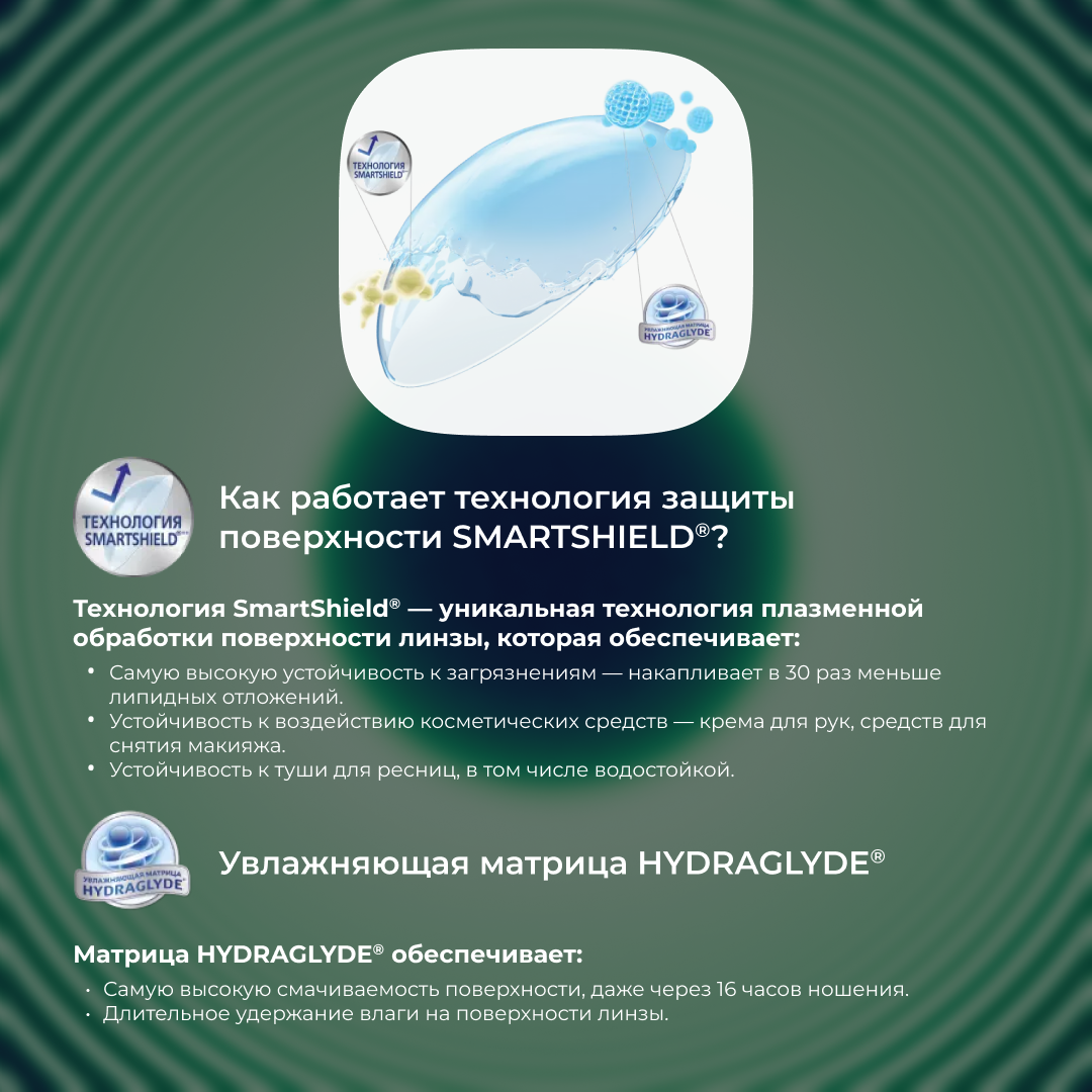 Мягкие силикон-гидрогелевые контактные линзы плановой замены для людей с астигматизмом (1 месяц ношения).Линзы Alcon Air Optix plus HydraGlyde for astigmatism обеспечивают комфорт и четкое зрение для людей с астигматизмом. Особая форма позволяет линзе всегда оставаться на месте, а матрица HydraGlyde обеспечивает увлажнение и комфорт в течение всего срока ношения.Ключевые особенности Air Optix plus HydraGlyde for astigmatizm1.Четкое зрениеДизайн Precision Balance 8|4 стабилизирует положение линзы на глазу, чтобы предотвратить «размывание» изображения. Технология учитывает естественный механизм моргания для сохранения стабильности линзы на глазу, для стабильно высокого качества зрения.2.Технология защиты поверхности SmartShield - уникальная технология плазменной обработки поверхности линзы, которая обеспечивает:•Высокую устойчивость к загрязнениям.•Устойчивость к воздействию косметических средств – крема для рук, средств для снятия макияжа.•Устойчивость к туши для ресниц, в том числе водостойкой.3.Увлажняющая матрица HydraGlyde обеспечивает:Длительное удержание влаги на поверхности линзы.
