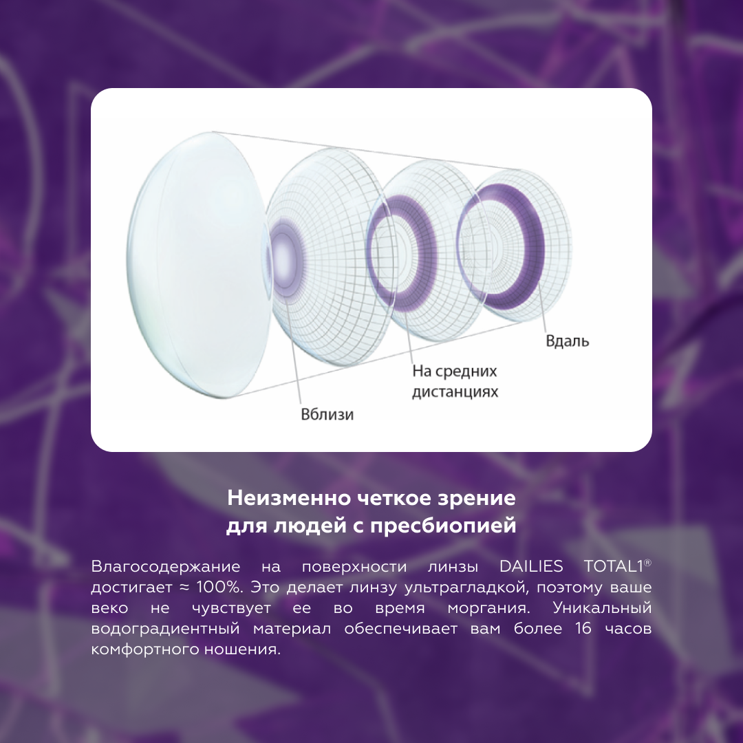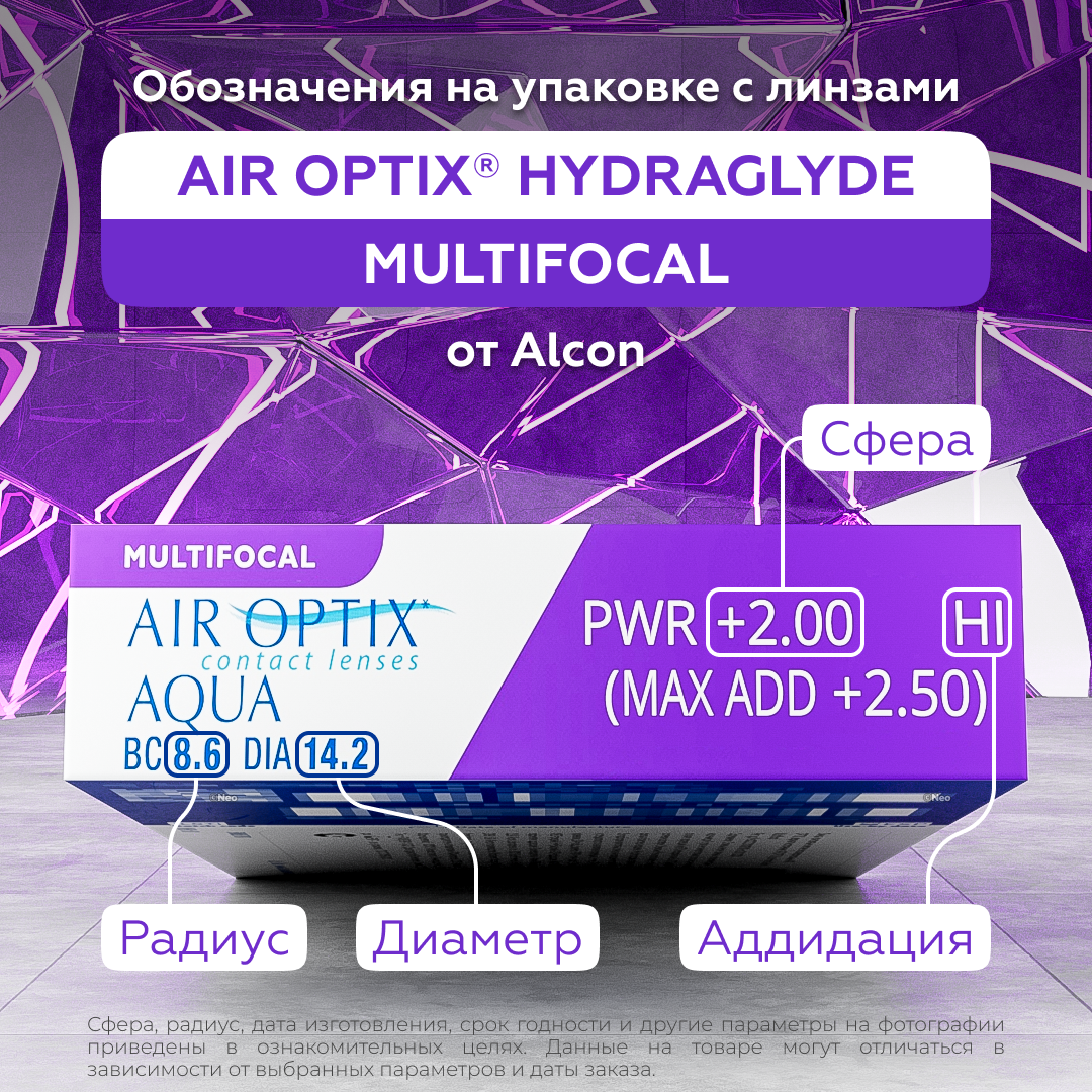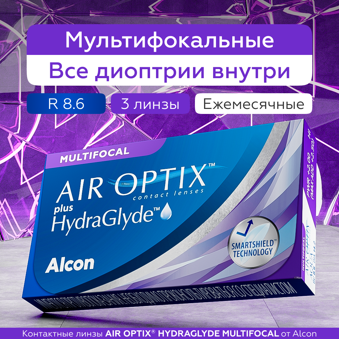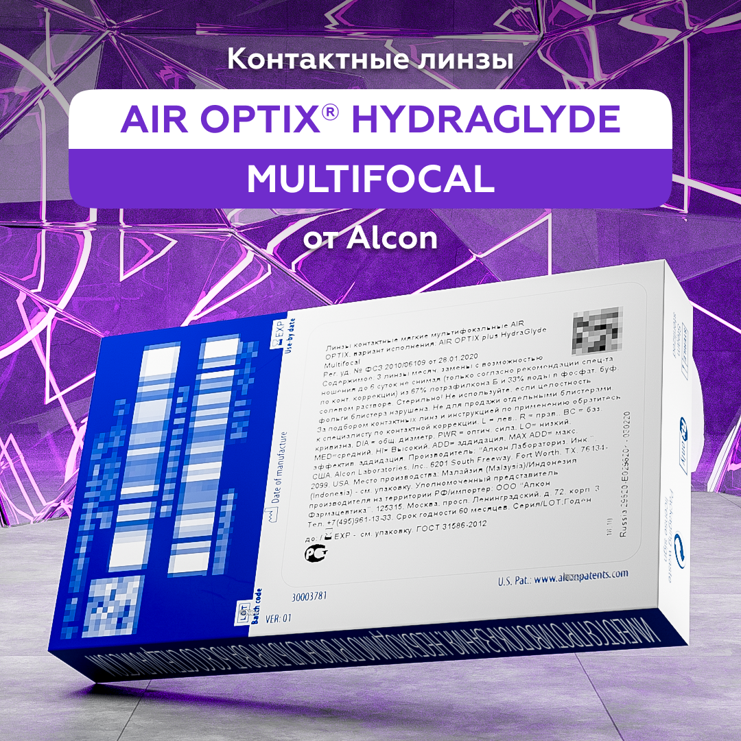 Контактные линзы AIROPTIX plus HYDRAGLYDE Multifocal от Alcon.Силикон-гидрогелевые контактные линзы плановой замены, разработаны специально для коррекции пресбиопии. Пресбиопия – возрастная дальнозоркость, характеризуется тем, что человек значительно лучше видит вдали, чем вблизи.С контактными линзами AIR OPTIX plus HYDRAGLYDE Multifocal Вы сможете без труда читать любой мелкий текст – в книге, на экране компьютера или мобильного телефона. Благодаря инновационным технологиям в одной линзе совмещены несколько зон с различной оптической силой. Это обеспечивает стабильно четкое зрение на любых расстояниях.Привычные вам линзы теперь получили новую технологию HydraGlyde для длительного увлажнения. Это позволит наслаждаться комфортом в линзах дольше: с утра до позднего вечера. Во всех контактных линзах семейства AIR OPTIX используется технология плазменной обработки поверхности, которая создает защитный увлажняющий слой. Это обеспечивает непрерывный комфорт в течение всего времени использования.Air Optix plus Hydraglyde Multifocal можно носить днем или непрерывно, не снимая для сна! При этом глазам будет комфортно благодаря высокому содержанию влаги в линзах и отличной способности пропускать кислород.Контактные линзы Air Optix plus Hydraglyde Multifocal имеют множество преимуществ:Чистые линзы на протяжении всего срока ношения. На этих контактных линзах не накапливаются отложения (вещества, содержащиеся в слезе, остатки косметических средств), которые оказывают влияние на качество зрения.Здоровье глаз. Контактная линза Air Optix plus Hydraglyde Multifocal пропускает в 5 раз больше кислорода по сравнению с традиционными контактными линзами.Высокая увлажненность. Линзы изготавливаются по технологии плазменной обработки края, что гарантирует создание защитного увлажняющего слоя. Это дарит беспрерывный комфорт в течение всего месяца ношения.Корректируйте возрастную дальнозоркость с помощью суперкомфортных Air Optix plus Hydraglyde Multifocal.важно! Прежде чем использовать мультифокальные линзы, обязательно проконсультируйтесь с офтальмологом.