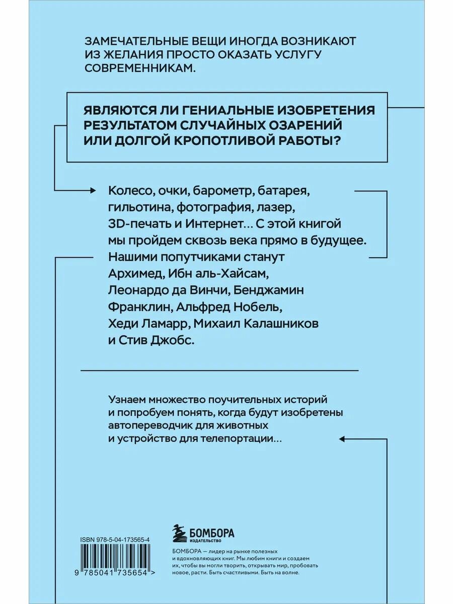 С этой книгой вы пройдете путь от доисторических времен сквозь Античность, Средневековье, Новое время, через современность в будущее, от каменных орудий труда до человекоподобных роботов, от колыбели человечества в Африке до места расцвета цифровых технологий в Калифорнии. Вашими попутчиками будут Архимед, Ибн аль-Хайсам, Леонардо да Винчи, Альфред Нобель, Михаил Калашников и Стив Джобс.