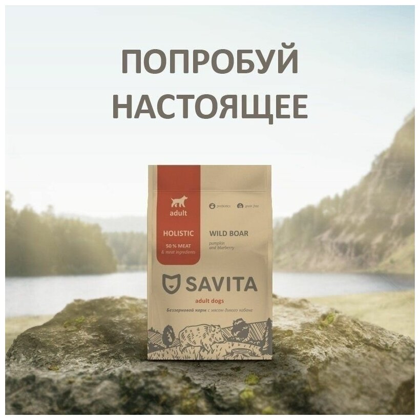 Savita - с уважением к дикой природе Вашего питомца Польза природных ингредиентов и многолетний опыт, объединённые с эффективностью современных технологий. Полнорационные и сбалансированные корма Savita класса холистик содержат высокий процент мясных ингредиентов, необходимых витаминов и минералов. Надолго обеспечивают собаку необходимой энергией на весь день. Каждый ингредиент тщательно подобран в соответствии с природными потребностями питомца и является важным компонентом в рецептуре корма, минимизируя риск возникновения аллергических реакций. Преимущества: Сбалансированная низкозерновая формула – в состав корма входит цельный бурый рис, который является источником углеводов, клетчатки, витаминов группы B; Не содержит глютен; Не содержит курицу; Высокий процент мяса и мясных ингредиентов; корма изготовлены из натурального сырья по стандарту качества human grade, Не содержат ГМО, сои, ароматизаторов, искусственных консервантов и красителей; Составы сухих кормов включают пребиотики, необходимые для здорового пищеварения питомца; Овощи, фрукты и травы в составах являются источниками антиоксидантов, витаминов и минералов. Размер гранул: 10 мм.