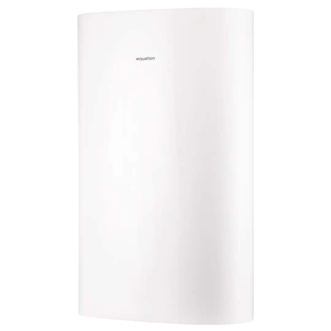 **Накопительный водонагреватель электрический Equation EQ 100 ST** мощностью 2 кВт и объемом 100 л снабдит горячей водой квартиру или частное домохозяйство. Рекомендован производителем для 4-х человек. Белая модель округлой формы размером 55,5 х 107,5 х 25 см и весом 26,2 кг крепится вертикально на стену, водоснабжение подключается снизу прибора. 2 бака ускоряют нагрев воды. Они произведены из нержавеющей стали, устойчивой к межкристаллитной коррозии. Нагревательные элементы в виде трубок (мокрый ТЭН) служат долго. Уровень нагрева воды регулируется при помощи механической ручки в диапазоне от 35 до 75°С. Система защиты останавливает нагрев при достижении водой температуры 75°С, УЗО предотвращает поражение током, специальный предохранительный клапан сливает воду и спасает от избыточного давления. Имеется защита от включения бойлера без воды.