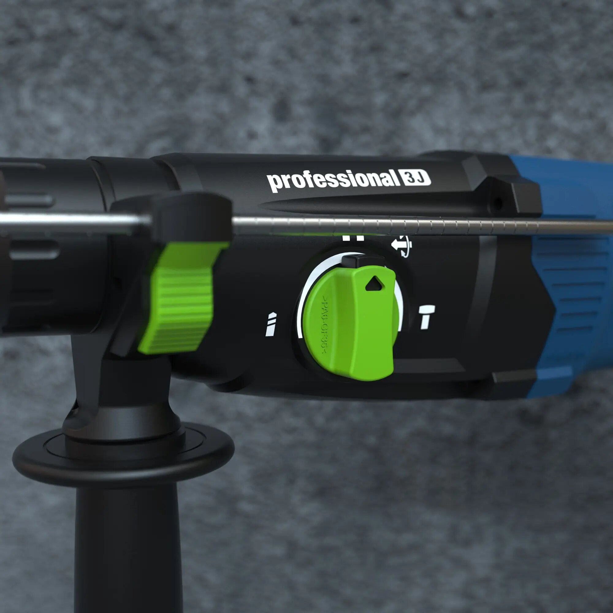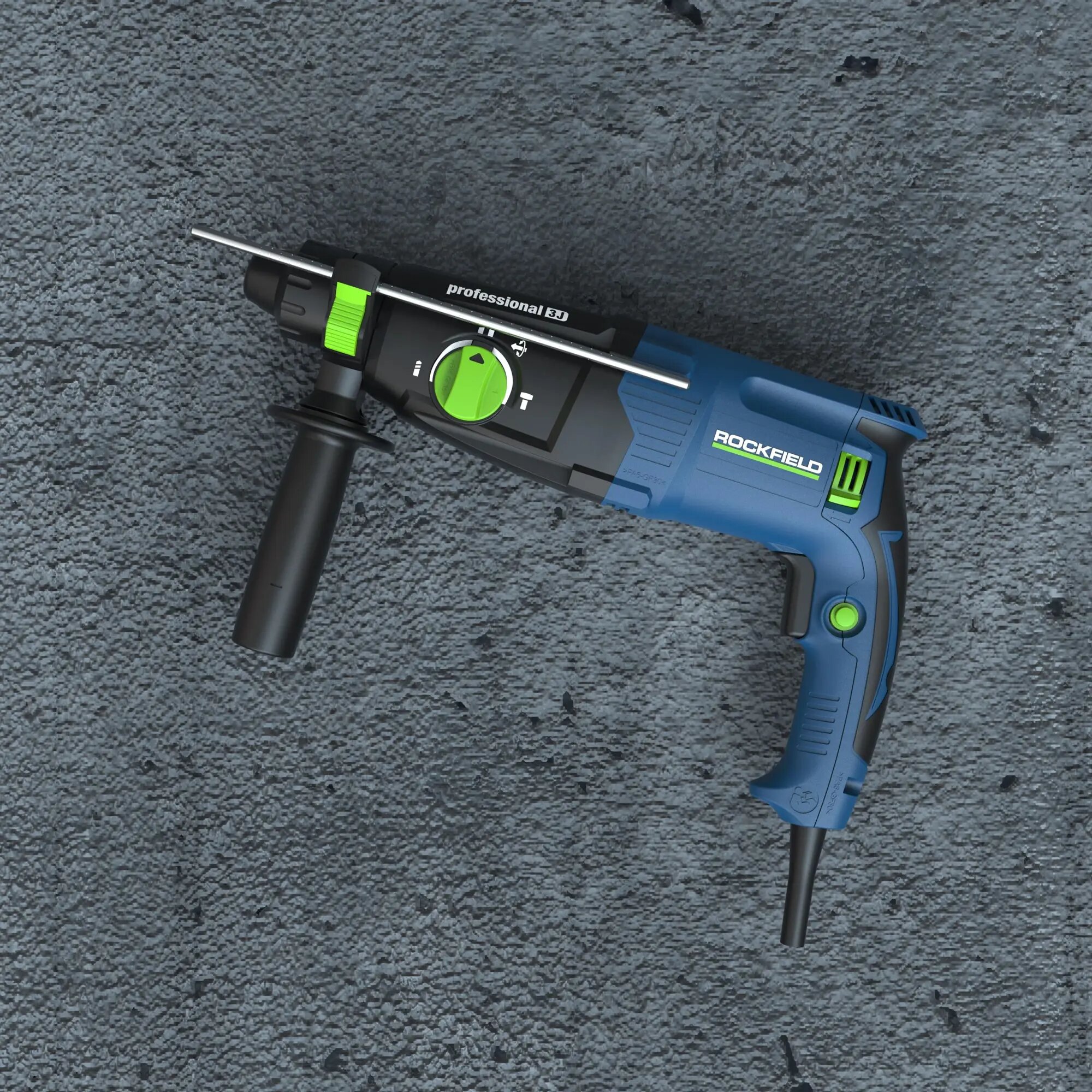**Перфоратор сетевой SDS-plus Rockfield RF28RHK** — высокопроизводительная и удобная в эксплуатации модель, предназначенная для выполнения ремонтно-монтажных работ. В основе работы лежит щеточный электродвигатель. Патрон системы SDS-Plus позволяет быстро поменять оснастку и обеспечить надежное крепление бура. Модель рассчитана на работу в режиме сверления, сверления с ударом, долбления. Благодаря этому можно подготовить отверстия в твердых поверхностях, сделать штробы и убрать старую плитку. Низкий уровень вибрации в сочетании с эргономичной рукояткой (дополнена прорезиненным слоем) обеспечивает надежный хват. Дополнительная ручка улучшает контроль над перфоратором. Число оборотов в этой модели регулируется электроникой. Лампа точечной подсветки дает возможность работать в условиях плохой освещенности. Предусмотрена защита от холостого хода.
