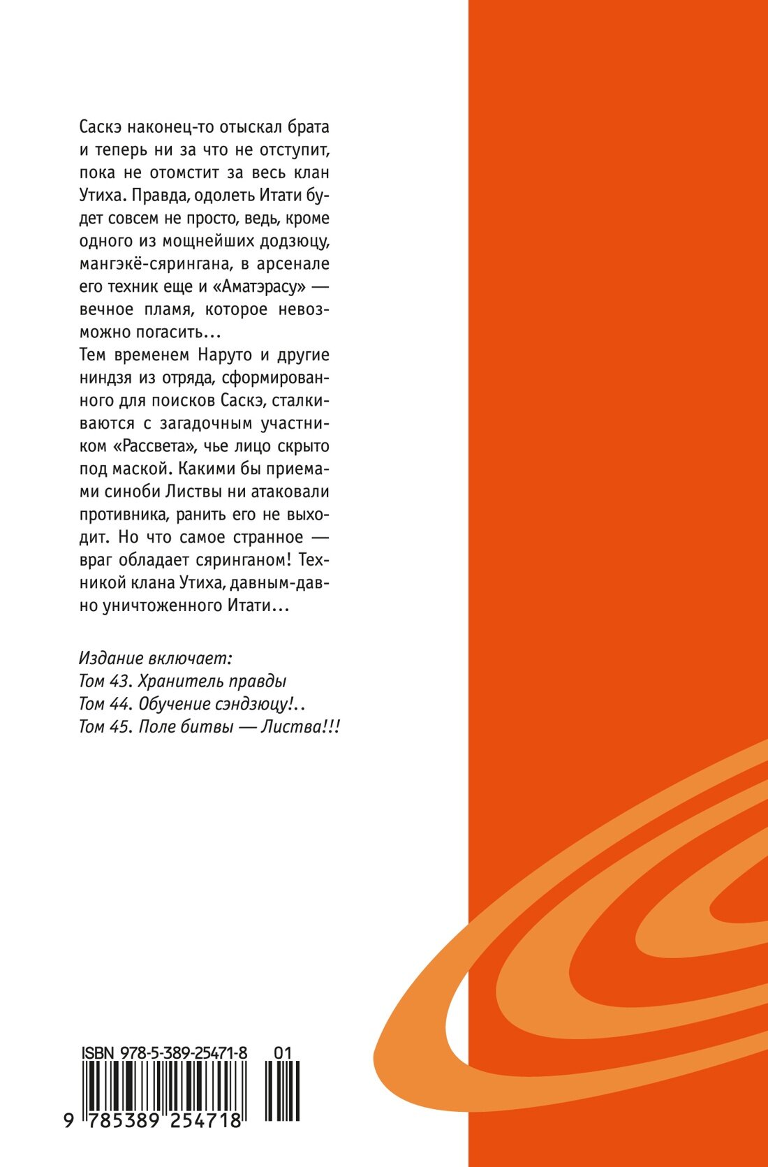 Саскэ наконец-то отыскал брата и теперь ни за что не отступит, пока не отомстит за весь клан Утиха. Правда, одолеть Итати будет совсем непросто, ведь кроме одного из мощнейших додзюцу, мангёко-сярингана, в арсенале его техник еще и «Аматерацу» — вечное пламя, которое невозможно погасить… Тем временем Наруто и другие ниндзя из отряда, сформированного для поисков Саскэ, сталкиваются с загадочным участником «Рассвета», чье лицо скрыто под маской. Какими бы приемами синоби Листвы не атаковали противника, ранить его не выходит. Но что самое странное – враг обладает сяринганом! Техникой клана Утиха, давным-давно уничтоженного Итати…