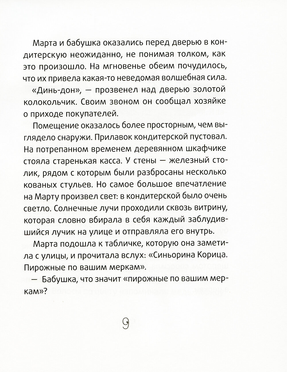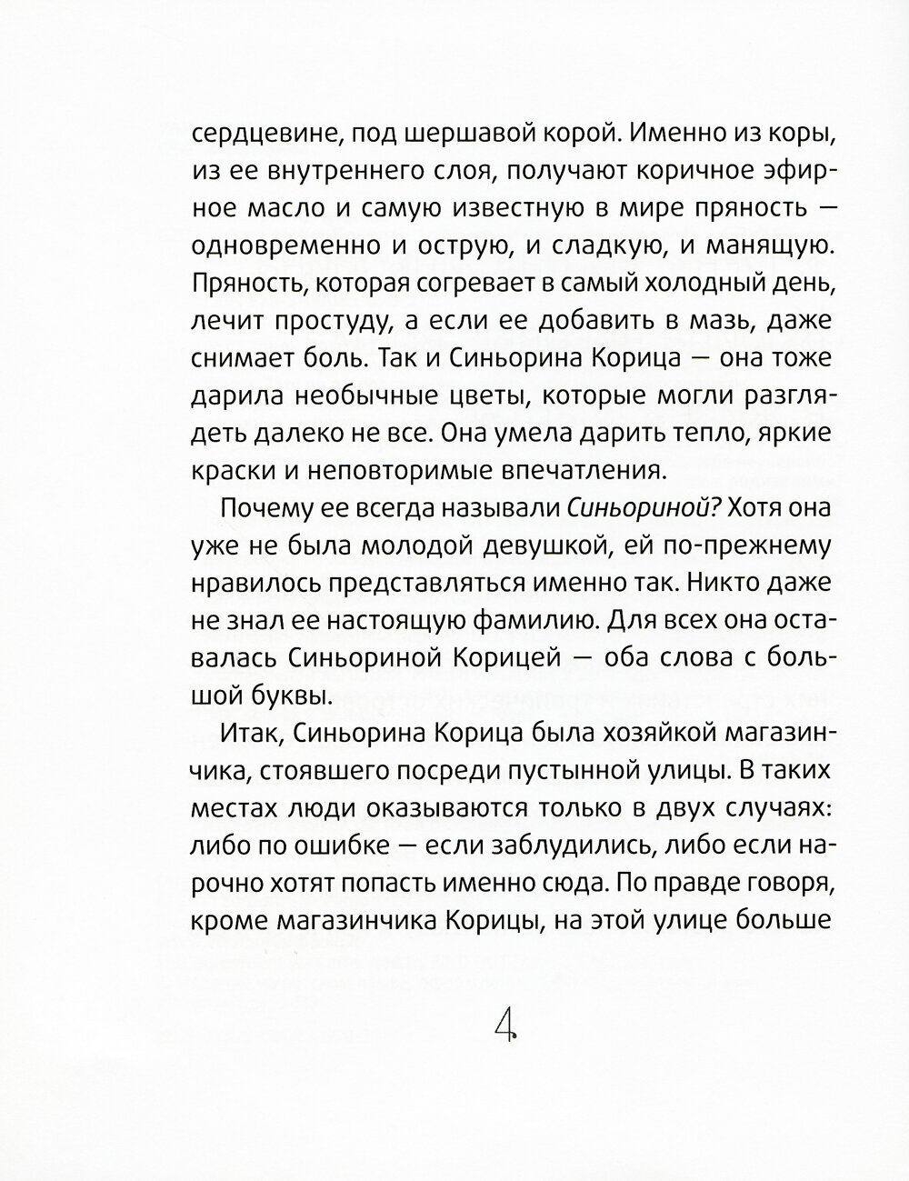 Когда двенадцатилетняя Марта забрела сюда, она сразу влюбилась в эти запахи, в аккуратные, но почему-то пустые витрины - даже ещё не зная об удивительных пирожных Синьорины Корицы! Сладости готовятся здесь исключительно по индивидуальному заказу. Чувствуешь себя неуверенно? Десерт "я-со-всем-справлюсь" подойдёт тебе! Поругался с родителями? Сладкая тартинка "подберу-правильные-слова-чтобы-помириться" - уже готова! Разве может кто-то желать зла такой волшебной кондитерской? Увы, может Марта и Маттео, ученики Синьорины Корицы, ищут способ спасти кондитерскую, но их идея приводит к неожиданным результатам.