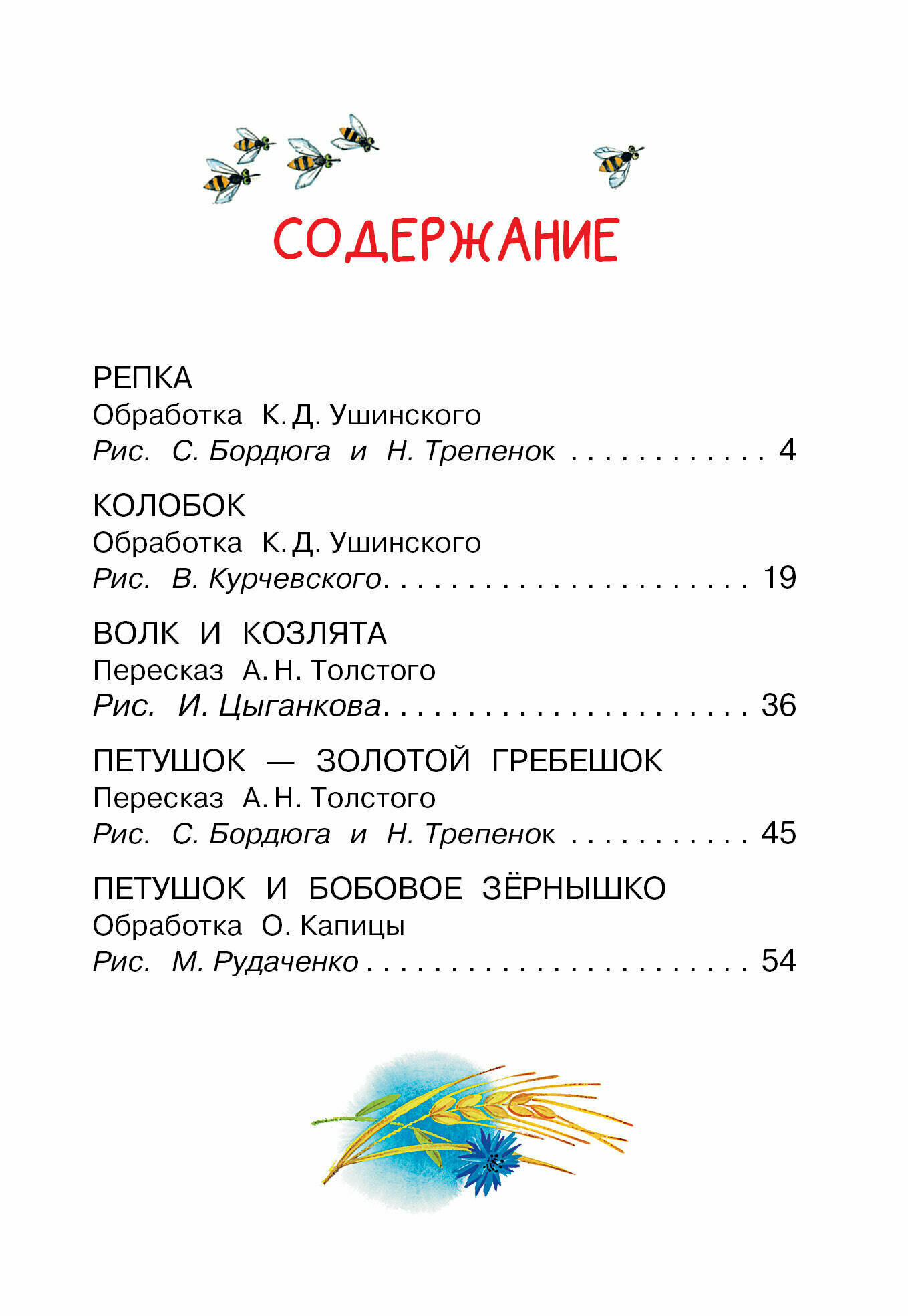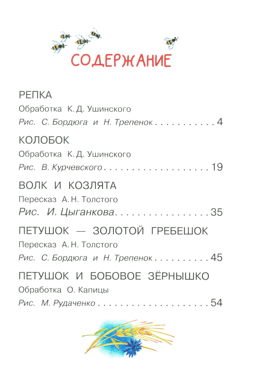 Сказки в обработке К. Д. Ушинского и О. Капицы, пересказе А. Н. Толстого.