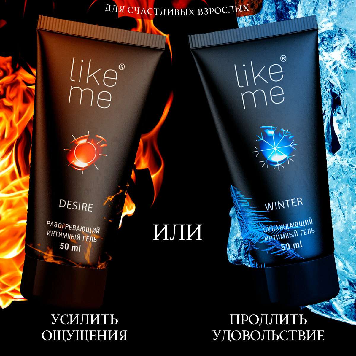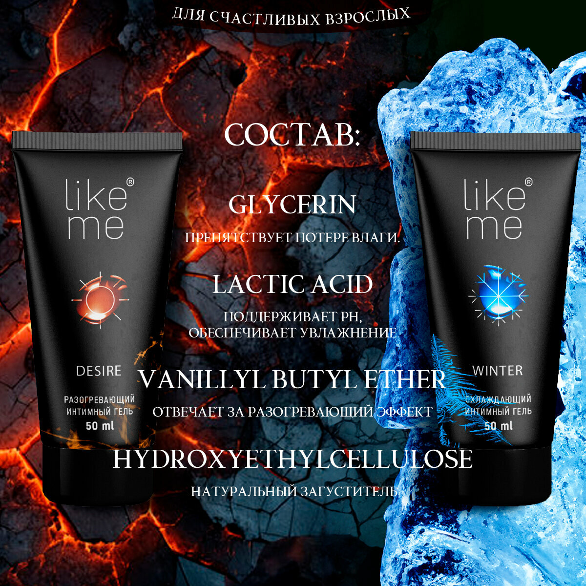 2 лубриканта ПО 50 МЛ + 2 презерватива В подарок. 1. LIKE ME DESIRE: Разогревающий интимный гель-смазка: Погрузитесь в мир удовольствия! Этот интимный гель-смазка с разогревающим эффектом создан для того, чтобы превратить ваш опыт во время секса или мастурбации в настоящее путешествие по чувствам и удовольствиям. Используйте его для увлажнения влагалища или анала во время интимных отношений или для более приятной анальной стимуляции. Стимулирующий гель-смазка идеально подходит для мужчин и женщин, для использования с секс игрушками или презервативами. Эта интим смазка возбудитель на водяной основе обладает уникальным разогревающим эффектом для двоих, который добавит острых ощущений и возбуждения в вашу интимную жизнь. Его гипоаллергенная формула безопасна для кожи и слизистых оболочек, не вызывая раздражения или жжения. Густая текстура геля обеспечивает экстра долгое скольжение, увлажняя и смягчая кожу, делая ее нежной и бархатистой. Безопасно для женского и мужского организма. Погрузитесь в мир взрослых наслаждений с этим возбуждающим лубрикантом - афродизиаком, который подарит вам и вашему партнеру невероятные ощущения. Его натуральная формула с перцем для стимуляции кровообращения и усиления ощущения, делая интимный опыт еще более ярким и захватывающим. Не отказывайте себе в удовольствии открыть новые грани удовольствия и возбуждения с этим уникальным разогревающим интимным гель-смазкой! 2. LIKE ME WINTER: Продлевающий гель увлажняющий на водной основе с охлаждающим эффектом чтобы продлить удовольствие. Не вызывает раздражение и жжения, не оставляет ощущения липкости и пятен на одежде; подходит для частого использования, анала и фистинга; Можно использовать как с презервативом, так и без него; Обеспечивает эффект ледокаина с холодным пролонгирующим действием; холодок имеет обезболивающий эффект; Делает кожу нежной и бархатистой, предотвращая появление микротрещин и надолго избавляет от сухости; для продления полового акта; эффект пролонгатора и анестетика.