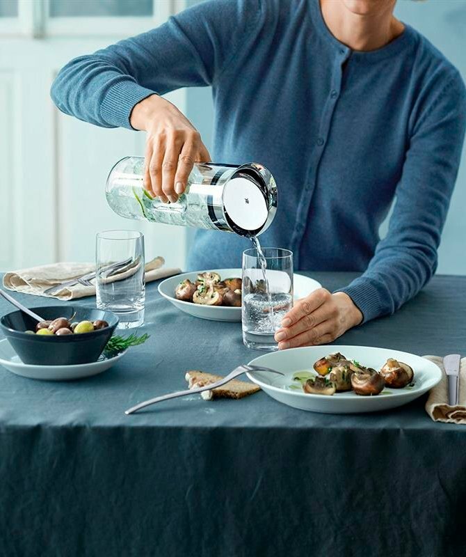 Стильный и удобный графин WMF с умной крышкой поможет поддерживать водный баланс.