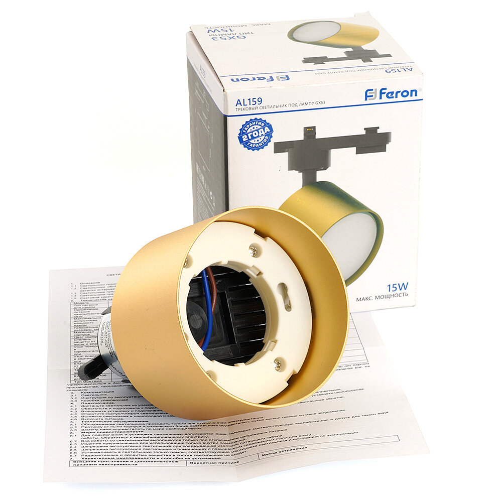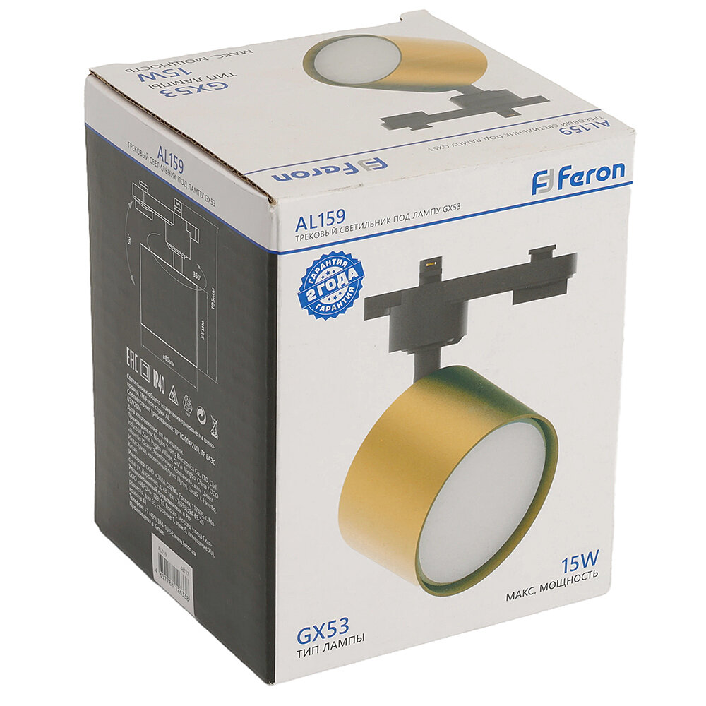 Трековый светильник AL159 Feron под лампу с цоколем GX53 уникальное предложение для российского рынка. Стильный дизайн в золотом цвете и компактное исполнение помогает легко вписать светильник в современный интерьер не опасаясь, даже в домах с невысокими потолками. Источником света в светильнике являются светодиодные лампы с цоколем GX53, что упрощает обслуживание светильника и позволяет с лёгкостью менять лампы, выбирать мощность и цветовую температуру. ОСОБЕННОСТИ: Удобство регулировки направления светового луча: светильник вращается на 350 по горизонтальной оси и на 180 по вертикальной оси Простой монтаж и надежная фиксация Технические отверстия на задней стороне светильнике для отвода тепла и продлевания срока службы лампы Ультратонкий адаптер идеально подходит к шинопроводу
