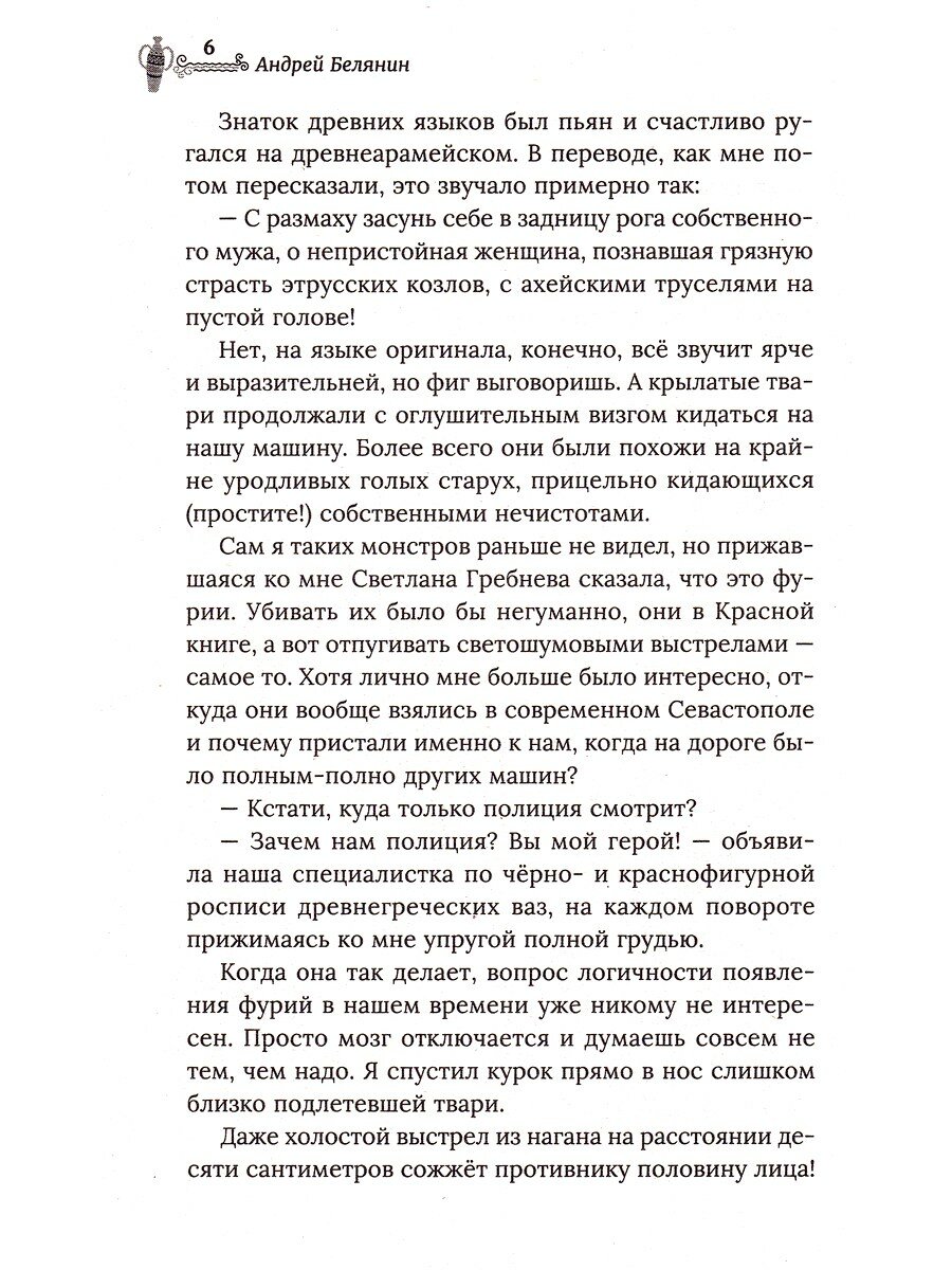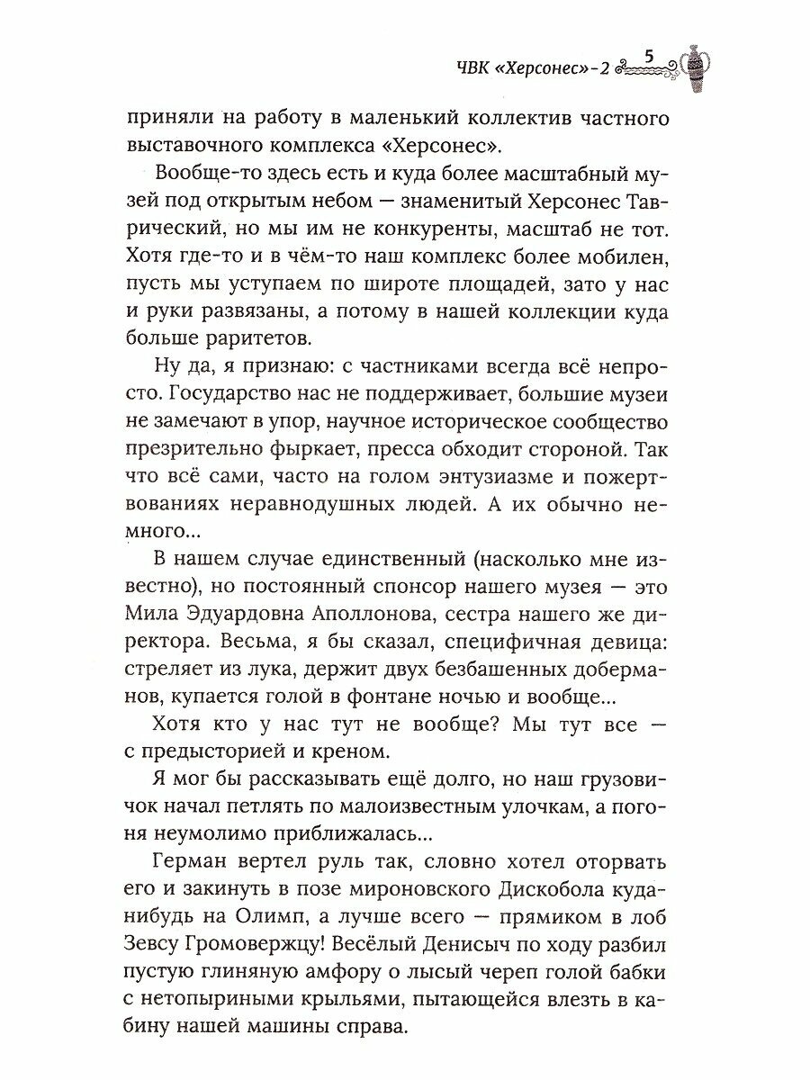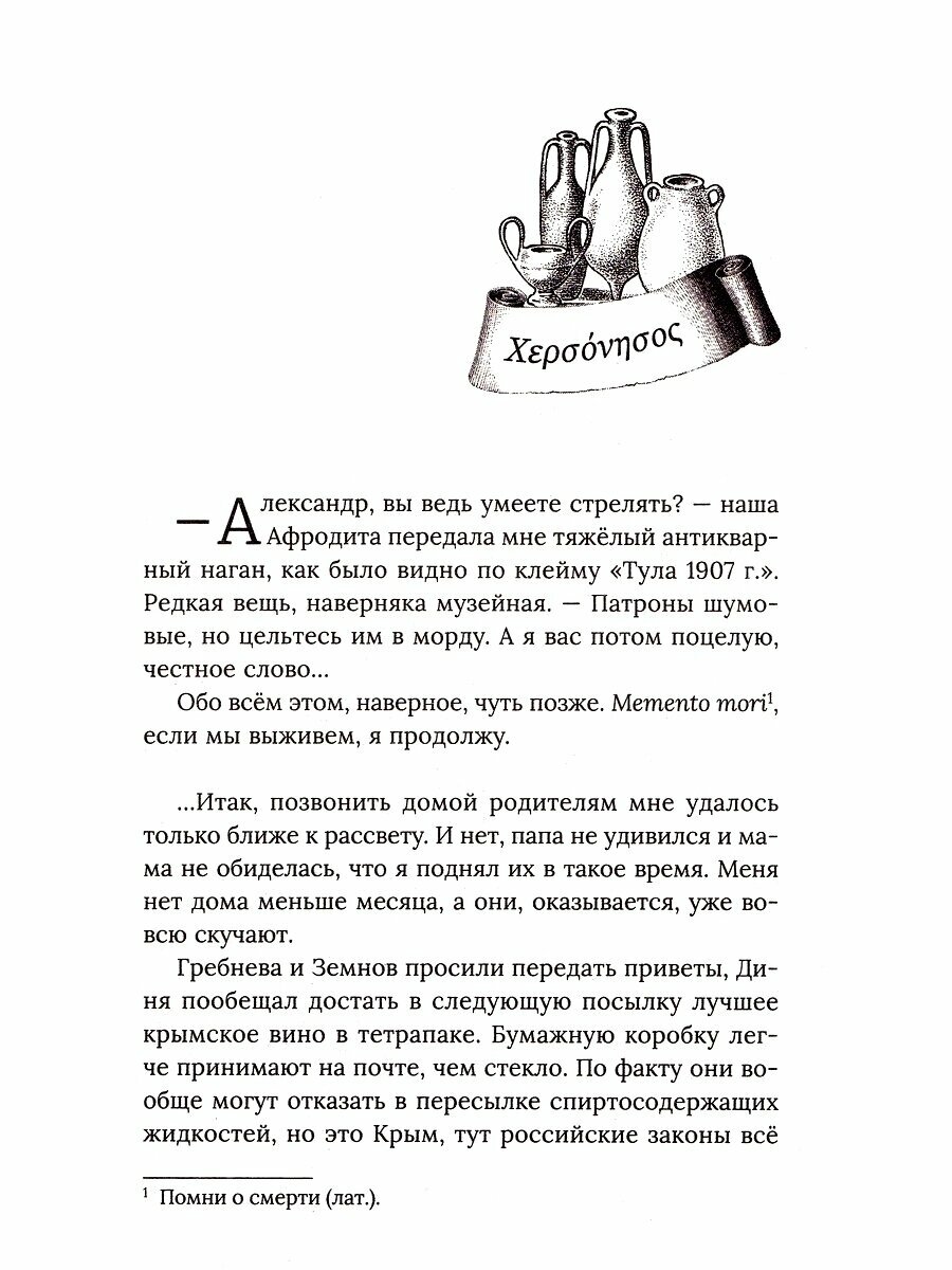 Тогда добро пожаловать к нам в ЧВК Херсонес! Откройте для себя красное вино Крыма, изумрудное море и синее небо Тавриды. Вас ждут перестрелки с гарпиями, поиски исчезнувших сокровищ, золотой конь царя Митридата, драки на нудистком пляже в Коктебеле, война с черными байкерами, кровавые жертвы Гекате, безбашенные доберманы, новые герои и старые враги!