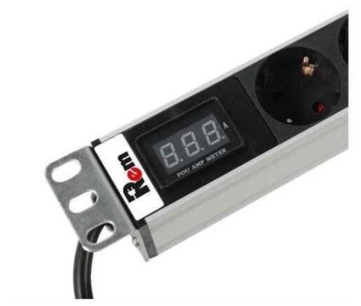 Блок силовых розеток имеет восемь портов стандарта Schuko, выполнен в анодированном алюминиевом корпусе. Розетки расположены под углом 45%, для удобного подсоединения коленчатых штекеров. На лицевой части блока установлен амперметр. Кабель питания 3 метра. Совместим со всеми линейками 19 монтажного оборудования. Поставляется с комплектом крепежа в индивидуальной упаковке. Выполнен в системе несущих конструкций 482,6 мм по ГОСТ 28601.2 (19-дюймовые конструктивы по МЭК 297).