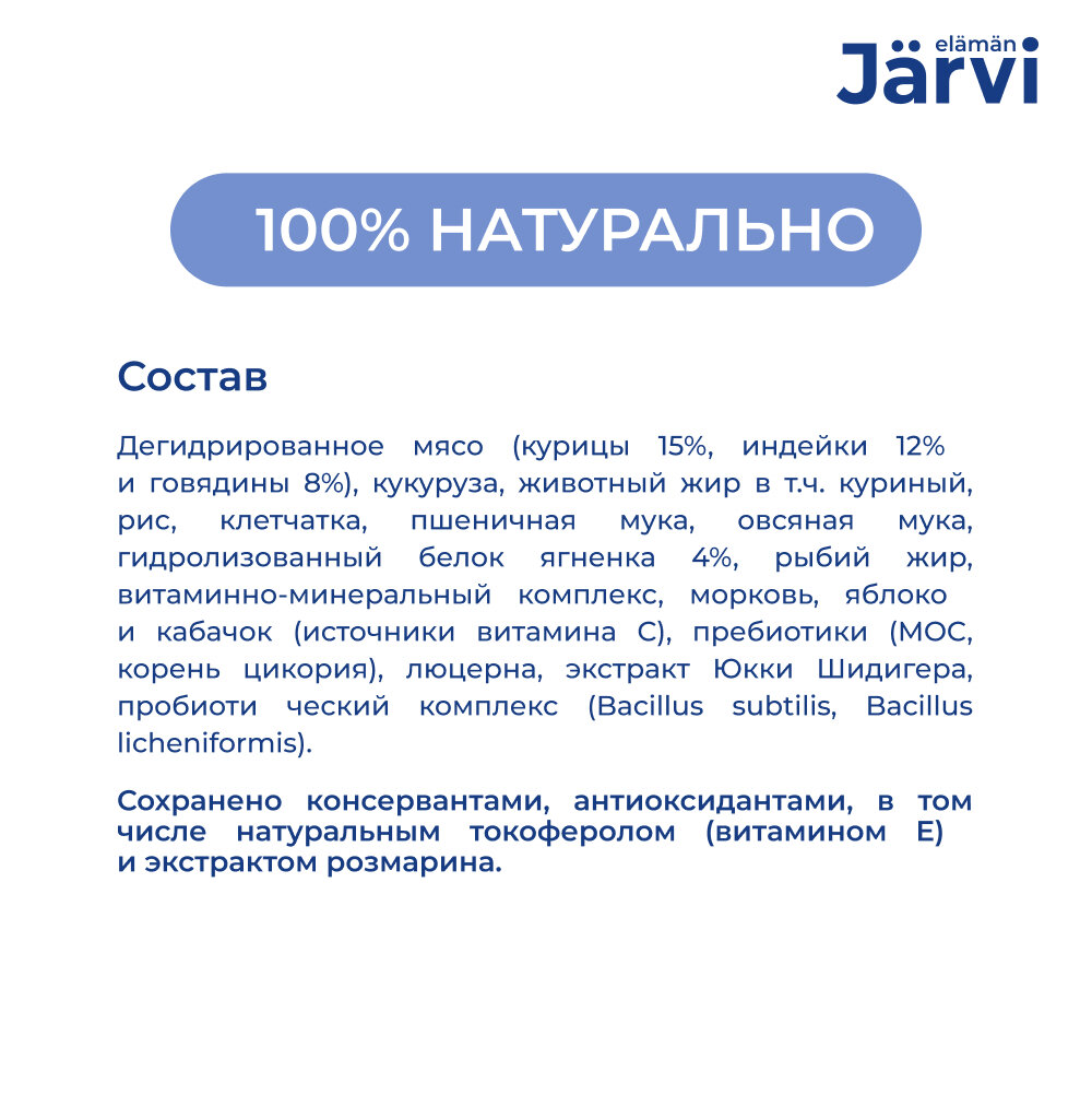 Сухой корм Jarvi для собак – это холистический, полнорационный корм для сбалансированного питания. Он соответствует высоким стандартам финского качества, разработан нутрициологами и одобрен ветеринарами. В составе корма присутствуют все необходимые витамины и микроэлементы для полноценного развития и здоровья вашего питомца. Естественные источники FOS, MOS и пробиотичесий комплекс обеспечивают хорошую усвояемость. Линейка кормов включает в себя несколько видов продуктов, которые можно подобрать под индивидуальные особенности вашего домашнего животного.
