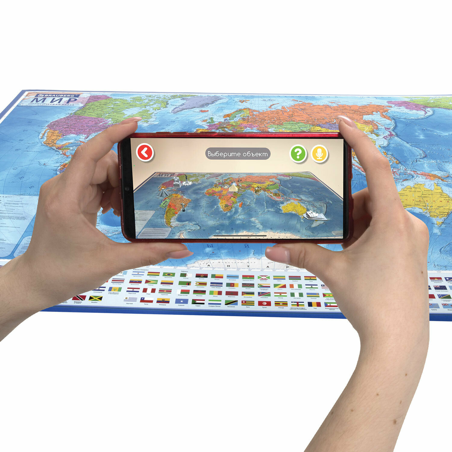 На политической карте мира BRAUBERG отображается современное политико-административное устройство мира: названия государств и их столицы, крупнейшие города и границы стран. Ниже расположены государственные флаги. Окунитесь в волшебный мир вместе с интерактивной картой мира BRAUBERG благодаря приложению IQ Globen!Начните свое путешествие в другие страны, наведя смартфон на государственные флаги. Помимо общих сведений о государствах, будут даны интересные факты о жителях, их обычаях и традициях. Возможности приложения на этом не заканчиваются: оно проведет пользователя по удивительным местам, поведает о растительном и животном мире, о первооткрывателях и космодромах, а также покажет достопримечательности. Скачайте приложение IQ Globen на IOS или Android, в главном меню выберите "Карты", откройте карту мира и наведите камеру на один из материков. Эффект дополненной реальности не заставит себя ждать. Герои приложения помогут в изучении мира.Настенная карта мира с масштабом 1:28 000 000 обладает размером 117х80 см. Выполнена из ламинированной бумаги плотностью 170 г/м2. Поставляется в упаковке с европодвесом.