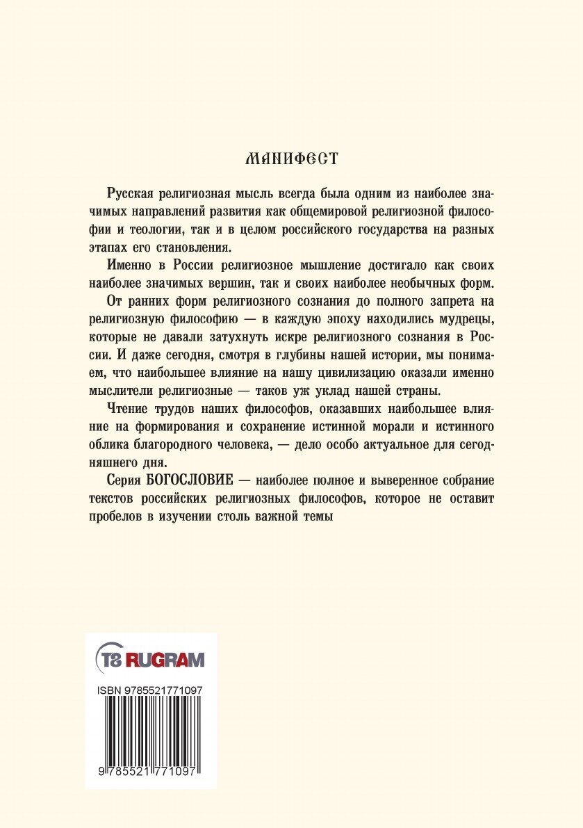 Русская религиозная мысль всегда была одним из наиболее значимых направлений развития как общемировой религиозной философии и теологии, так и в целом российского государства на разных этапах его становления. Именно в России религиозное мышление достигало как своих наиболее значимых вершин, так и своих наиболее необычных форм. От ранних форм религиозного сознания до полного запрета на религиозную философию - в каждую эпоху находились мудрецы, которые не давали затухнуть искре религиозного сознания в России. И даже сегодня, смотря в глубины нашей истории, мы понимаем, что наибольшее влияние на нашу цивилизацию оказали именно мыслители религиозные - таков уж уклад нашей страны. Чтение трудов наших философов, оказавших наибольшее влияние на формирования и сохранение истинной морали и истинного облика благородного человека, - дело особо актуальное для сегодняшнего дня. Серия богословие - наиболее полное и выверенное собрание текстов российских религиозных философов, которое не оставит пробелов в изучении столь важной темы.Издательство RUGRAMМягкий переплетОбъем - 226 стр.Формат - 148x210 мм.ISBN 978-5-521-77109-7Год издания: 2022