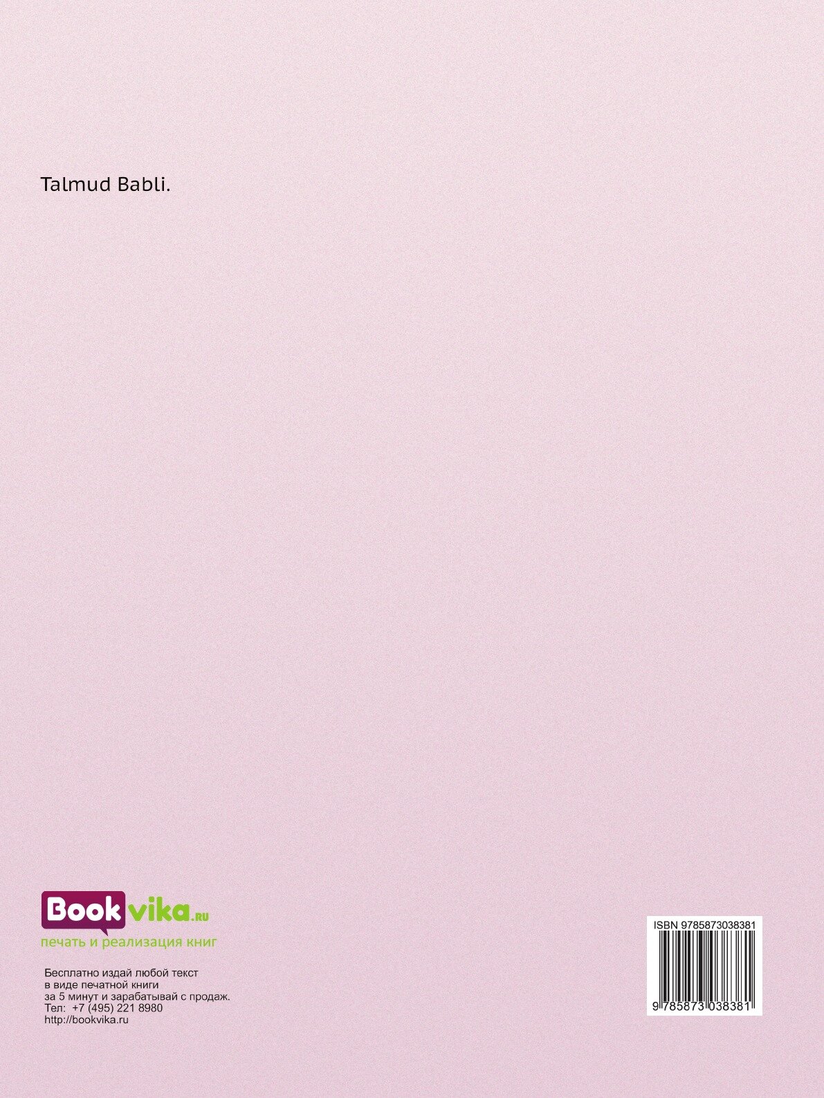 Эта книга - репринт оригинального издания (издательство "London B. Vaynberg", 1921 год), созданный на основе электронной копии высокого разрешения, которую очистили и обработали вручную, сохранив структуру и орфографию оригинального издания. Редкие, забытые и малоизвестные книги, изданные с петровских времен до наших дней, вновь доступны в виде печатных книг.Talmud Babli.Издательство Нобель ПрессМягкий переплетОбъем - 244 стр.Формат - 148x210 мм.ISBN 978-5-8730-3838-1Год издания: 2011