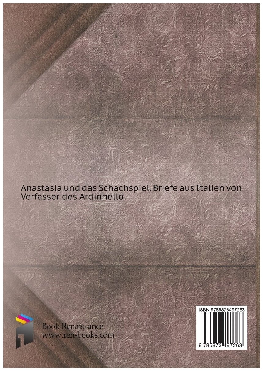 Эта книга - репринт оригинального издания (издательство "F. Boselli", 1815 год), созданный на основе электронной копии высокого разрешения, которую очистили и обработали вручную, сохранив структуру и орфографию оригинального издания. Редкие, забытые и малоизвестные книги, изданные с петровских времен до наших дней, вновь доступны в виде печатных книг.Anastasia und das Schachspiel. Briefe aus Italien von Verfasser des Ardinhello.Издательство Нобель ПрессМягкий переплетОбъем - 525 стр.Формат - 148x210 мм.ISBN 978-5-8734-9726-3Год издания: 2011