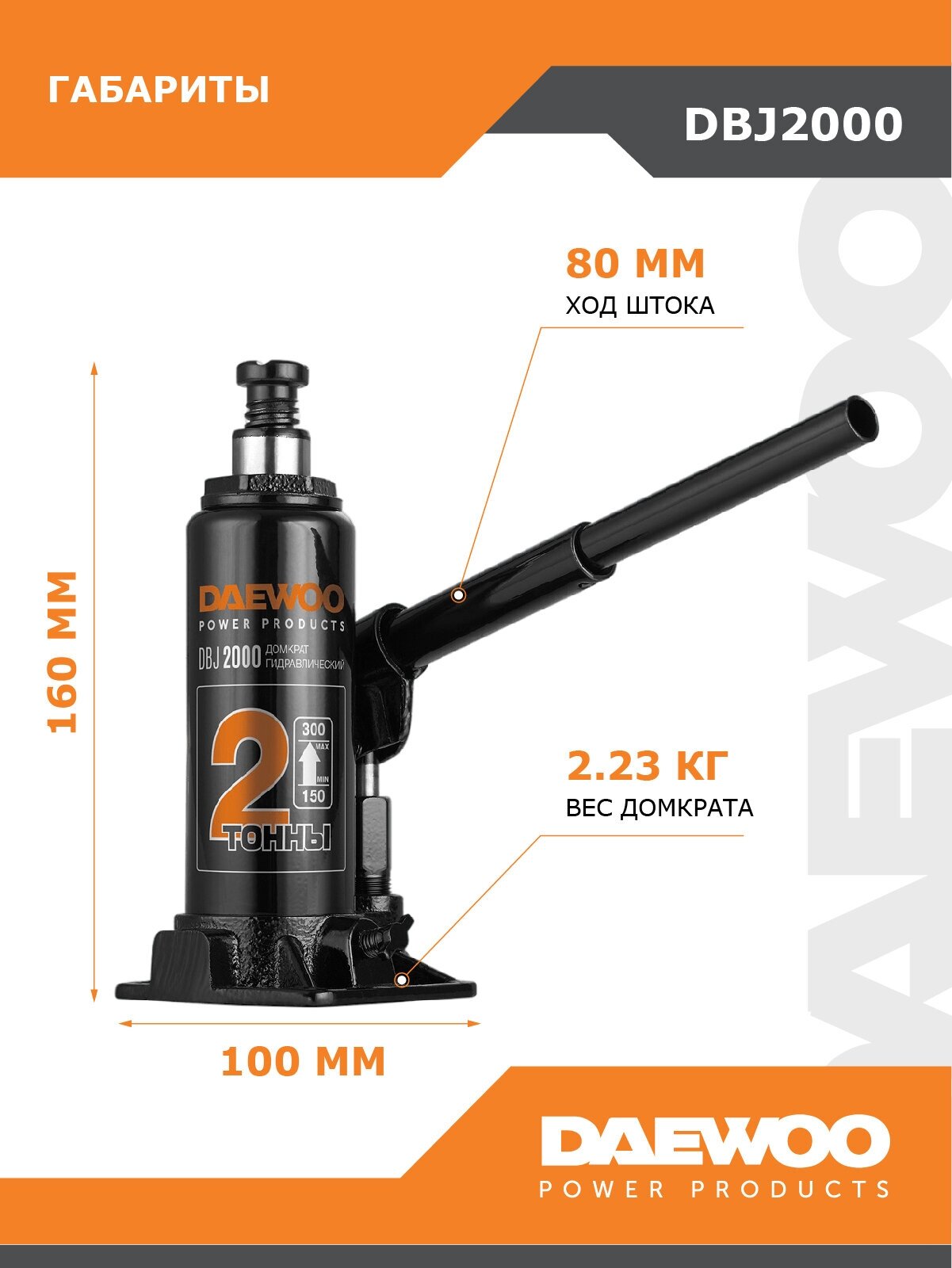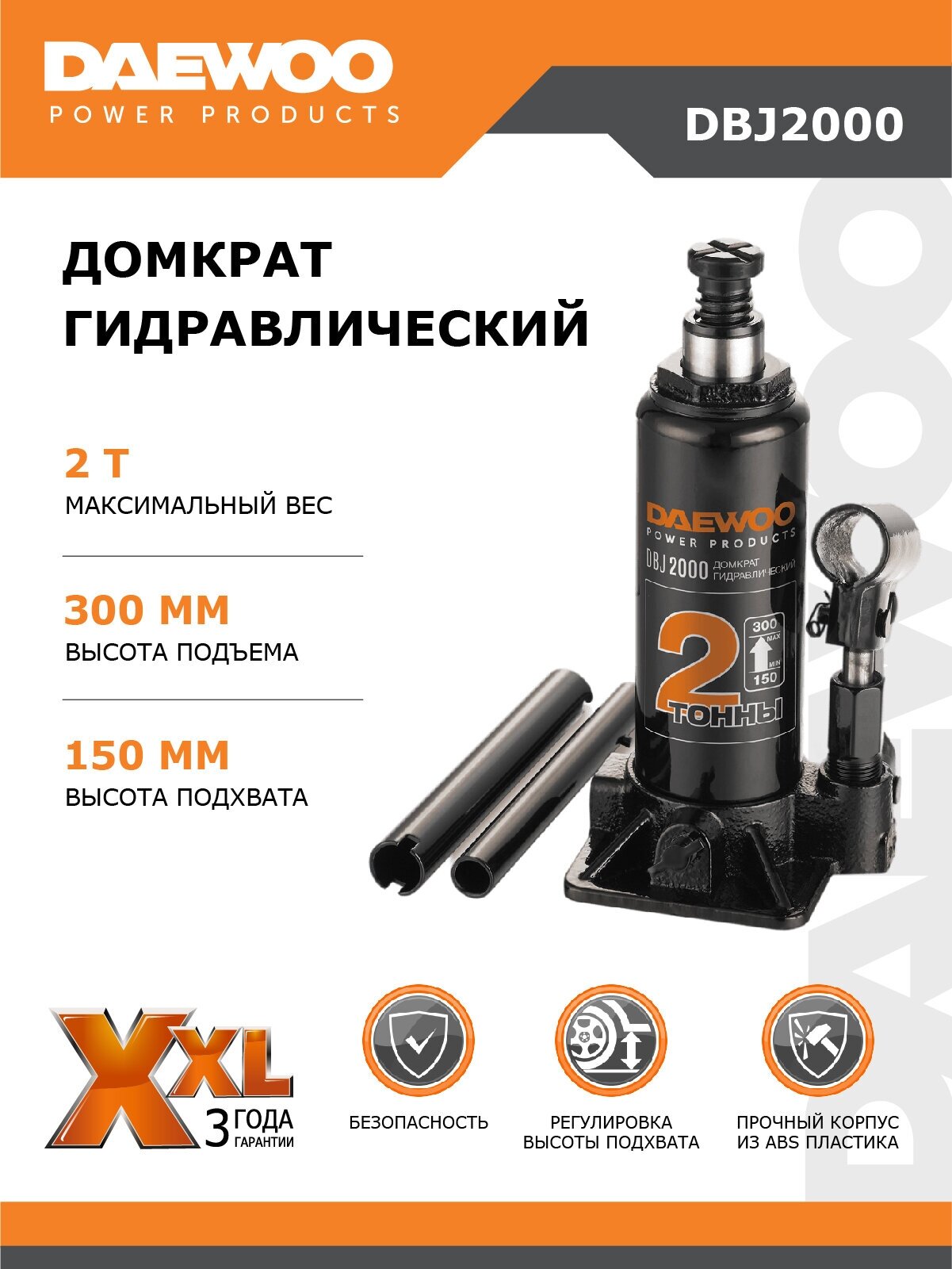 Домкрат бутылочный DAEWOO 2 т min 150mm - max 300mm DBJ2000